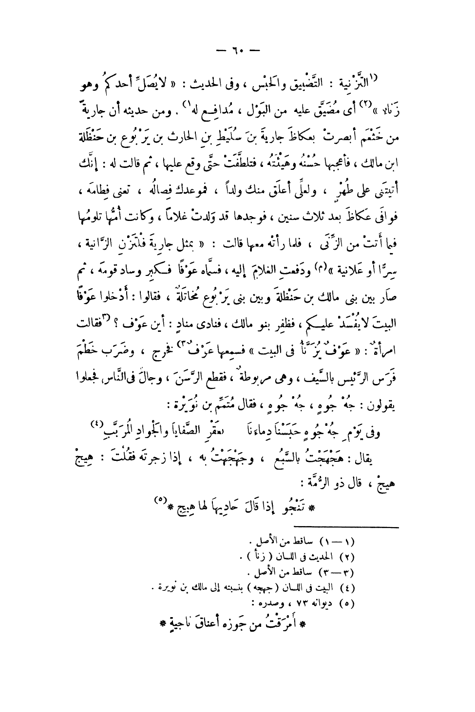 وَمن حَدِيثه أَن جَارِيَة من خثعم أَبْصرت بعكاظ جَارِيَة بن سليط بن الْحَارِث بن يَرْبُوع بن حَنْظَلَة ابْن مَالك فأعجبها حسنه وهيئته فتلطفت حَتَّى وَقع عَلَيْهَا ثمَّ قَالَت لَهُ إِنَّك أتيتنى على طهرٍ ولعلى أعلق مِنْك ولدا فموعدك فصاله تعنى فطامه فَوَافى عكاظ بعد ثَلَاث سِنِين فَوَجَدَهَا قد ولدت غُلَاما وَكَانَت أمهَا تلومها فِيمَا أَتَت من الزِّنَى فَلَمَّا رَأَتْهُ مَعهَا قَالَت بِمثل جَارِيَة فلتزن الزَّانِيَة سرا أَو عَلَانيَة وَدفعت الْغُلَام إِلَيْهِ فَسَماهُ عوفاً فَكبر وساد قومه ثمَّ صَار بَين بنى مَالك بن حَنْظَلَة وَبَين بنى يَرْبُوع مخاتلةٌ فَقَالُوا أدخلُوا عوفاً الْبَيْت لَا يفْسد عَلَيْكُم فظفر بَنو مَالك فَنَادَى منادٍ أَيْن عَوْف فَقَالَت امرأةٌ عوفٌ يزنأ فِي الْبَيْت فَسَمعَهَا عَوْف فَخرج وَضرب خطم فرس الرئيس بِالسَّيْفِ وَهِي مربوطةٌ فَقطع الرسن وجال فِي النَّاس فَجعلُوا يَقُولُونَ جه جوهٍ جه جوهٍ فَقَالَ متمم بن نُوَيْرَة
