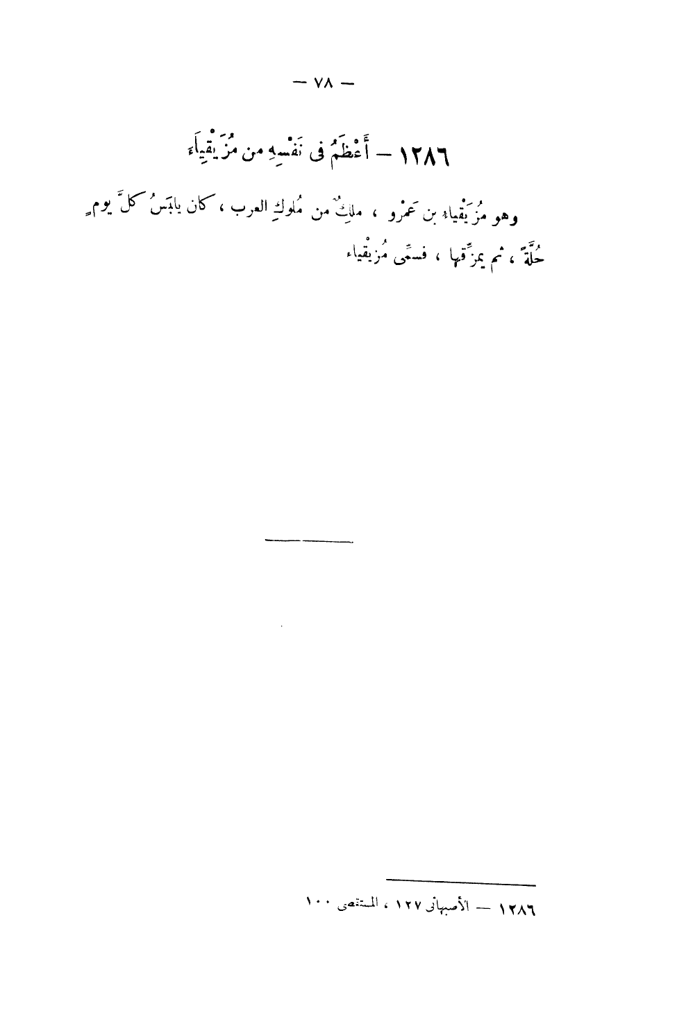 وَهُوَ مزيقياء بن عَمْرو ملكٌ من مُلُوك الْعَرَب كَانَ يلبس كل يومٍ حلَّة ثمَّ يمزقها فَسمى مزيقياء