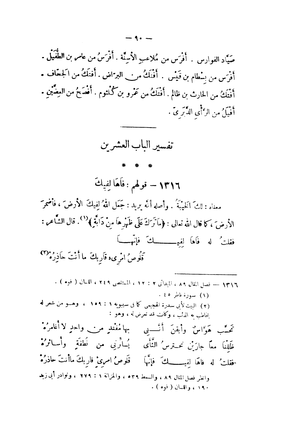 مَعْنَاهُ لَك الخيبة وَأَصله أَنه يُرِيد جعل الله لفيك الأَرْض فأضمر الأَرْض كَمَا قَالَ الله تَعَالَى {مَا ترك على ظهرهَا من دابةٍ} قَالَ الشَّاعِر