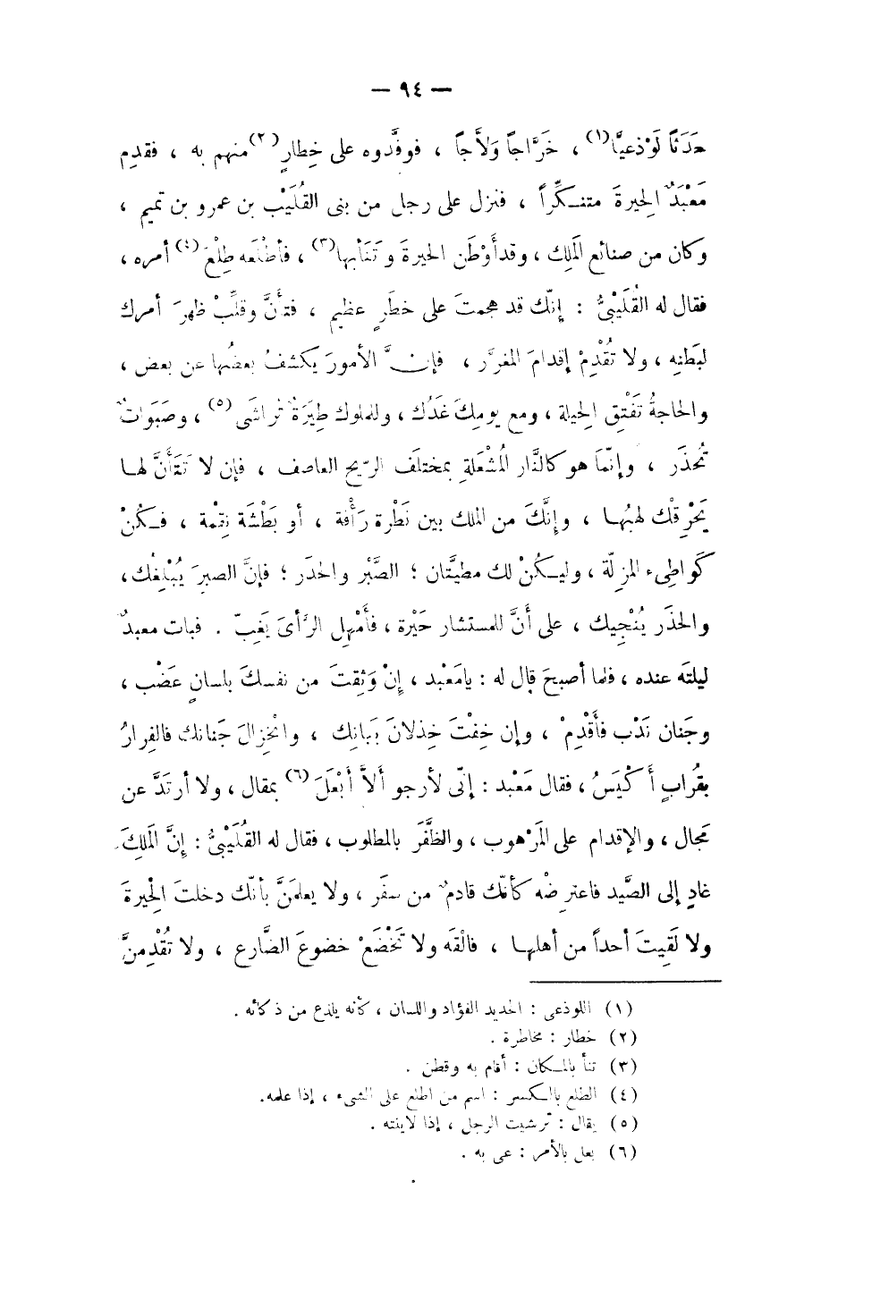 حَدثا لوذعياً خراجاً ولاجاً فوفدوه على خطارٍ مِنْهُم بِهِ فَقدم معبدٌ الْحيرَة متنكراً فَنزل على رجل من بنى القليب بن عَمْرو بن تَمِيم وَكَانَ من صنائع الْملك وَقد أوطن الْحيرَة وتنأ بهَا فأطلعه طلع أمره فَقَالَ لَهُ القليبى إِنَّك قد هجمت على خطرٍ عَظِيم فتأن وقلب ظهر أَمرك لبطنه وَلَا تقدم إقدام المغرر فَإِن الْأُمُور يكْشف بَعْضهَا عَن بعض وَالْحَاجة تفتق الْحِيلَة وَمَعَ يَوْمك غدك وللملوك طيرةٌ تراشى وصبواتٌ تحذر وَإِنَّمَا هُوَ كالنار المشتعلة بمختلف الرّيح العاصف فَإِن لَا تتأن لَهَا يحرقك لهبها وَإنَّك من الْملك بَين نطرة رأفة أَو بطشة نقمة فَكُن كواطئ المزلة وَليكن لَك مطيتان الصَّبْر والحذر فَإِن الصَّبْر يبلغك والحذر ينجيك على أَن للمستشار حيرة فأمهل الرأى يغب فَبَاتَ معبدٌ ليلته عِنْده فَلَمَّا أصبح قَالَ لَهُ يَا معبد إِن وثقت من نَفسك بِلِسَان عضبٍ وجنان ندب فأقدم وَإِن خفت خذلان بيانك وانخزال جنانك فالفرار بقرابٍ أَكيس فَقَالَ معبد إنى لأرجو أَلا أبعل بمقال وَلَا ارْتَدَّ عَن مجَال والإقدام على المرهوب وَالظفر بالمطلوب فَقَالَ لَهُ القليبى إِن الْملك غادٍ إِلَى الصَّيْد فاعترضه كَأَنَّك قادمٌ من سفر وَلَا يعلمن بأنك دخلت الْحيرَة وَلَا لقِيت أحدا من أَهلهَا فالقه وَلَا تخضع خضوع الضارع وَلَا تقدمن