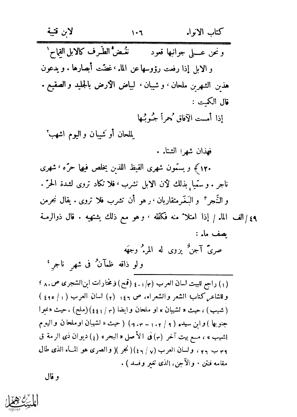 والابل إذا رفعت رؤوسها عن الماء، غضّت أبصارها. ويدعون هذين الشهرين ملحان، وشيبان، لبياض الأرض بالجليد والصقيع.