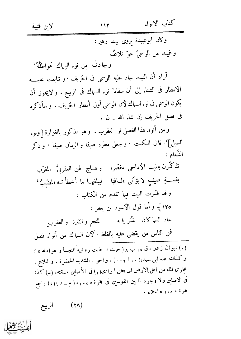 أراد أن النبت جاد عليه الوسمى فى الخريف، وتتابعت عليه الأمطار فى الشتاء إلى أن سقاه «2» نوء السماك فى الربيع. ولا يجوز أن يكون الوسمى فى نوء السماك لأن الوسمى أول أمطار الخريف. وسأذكره فى فصل الخريف إن شاء الله- ن.