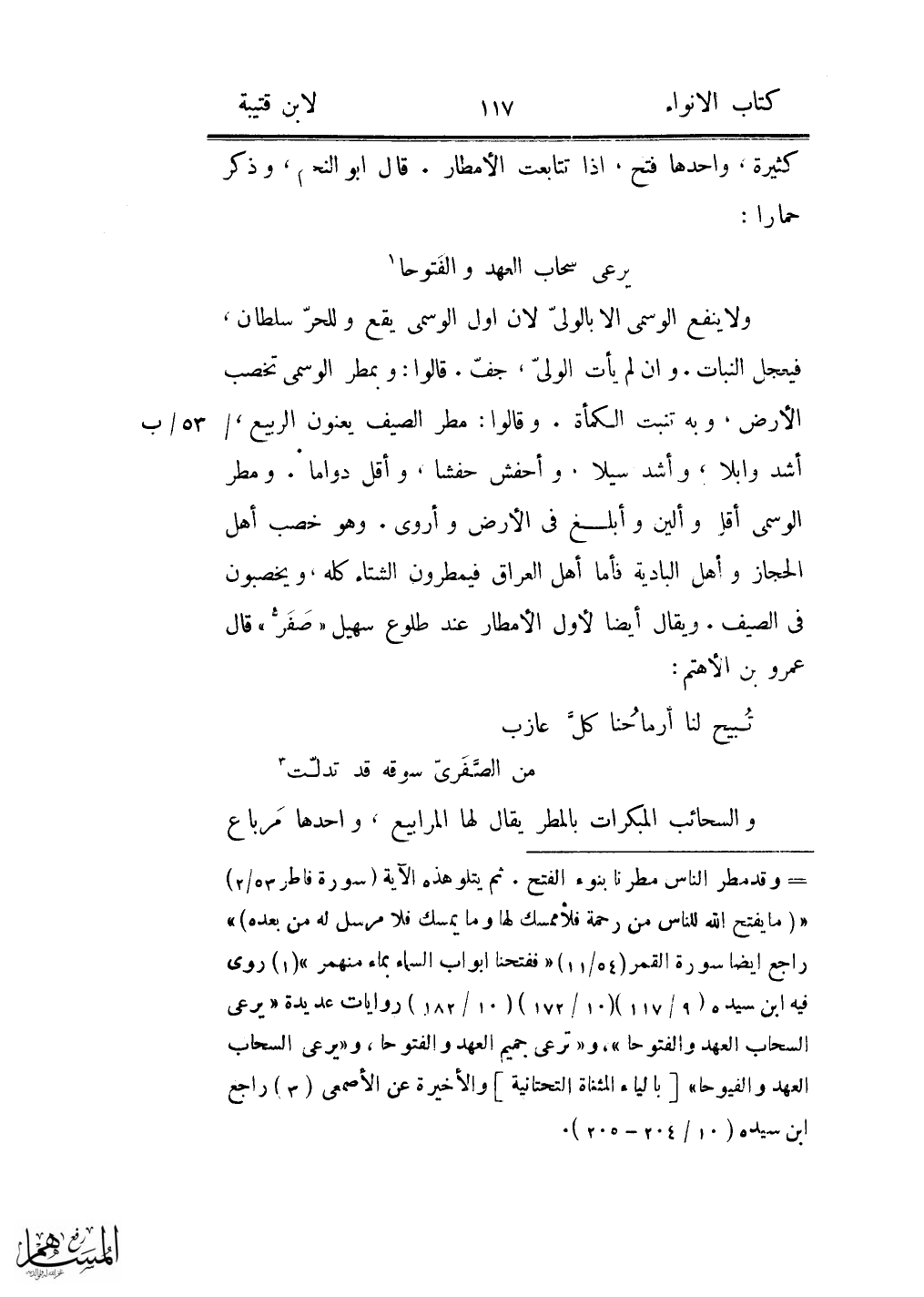 ولا ينفع الوسمى الا بالولىّ لان اول الوسمى يقع وللحرّ سلطان، فيجعل النبات. وان لم يأت الولىّ، جفّ. قالوا: وبمطر الوسمى تخصب الأرض، وبه تنبت الكمأة. وقالوا: مطر الصيف يعنون الربيع،/ أشد وابلا، وأشد سيلا، وأحفش حفشا، وأقل دواما. ومطر الوسمى أقل وألين وأبلغ فى الأرض وأروى. وهو خصب أهل الحجاز وأهل البادية فأما أهل العراق فيمطرون الشتاء كله، ويخصبون فى الصيف. ويقال أيضا لأول الأمطار عند طلوع سهيل «صفرّ» قال عمرو بن الأهتم: