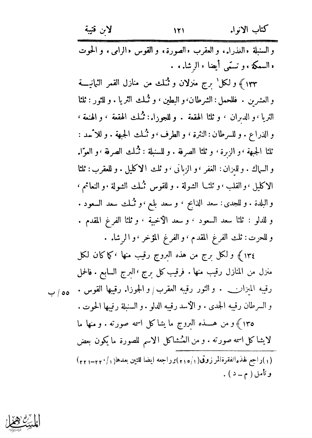 133) ولكل «1» برج منزلان وثلث من منازل القمر الثمانية والعشرين. فللحمل: الشرطان، والبطين، وثلث الثريا. وللثور: ثلثا الثريا، والدبران، وثلثا الهقعة. وللجوزاء: ثلث الهقعة، والهنعة، والذراع. وللسرطان: النثرة، والطرف، وثلث الجبهة. وللأسد: