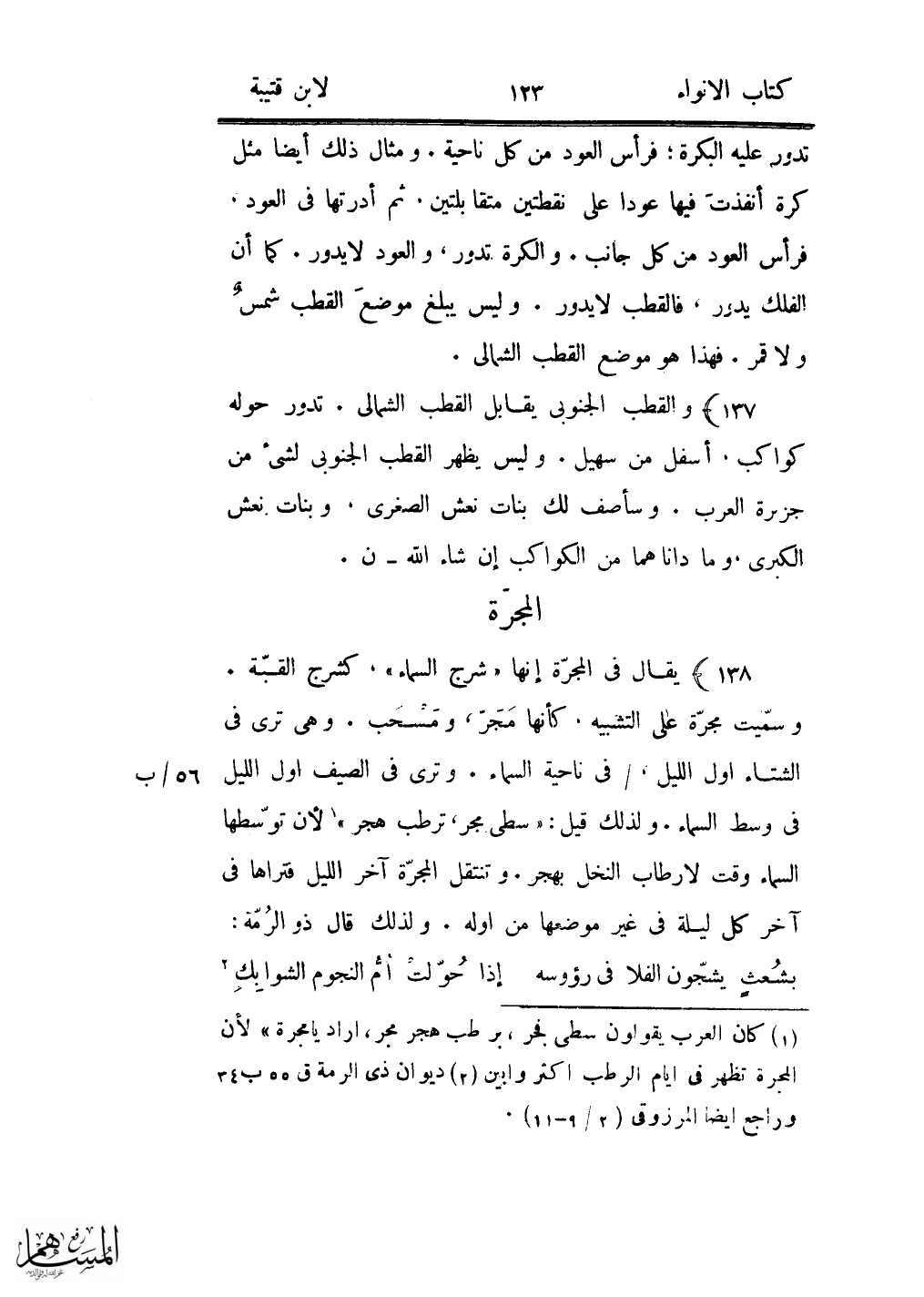 وسمّيت مجرّة على التشبيه، كأنها مجرّ، ومسحب. وهى ترى فى الشتاء اول الليل، / فى ناحية السماء. وترى فى الصيف اول الليل فى وسط السماء. ولذلك قيل: «سطى مجر، ترطب هجر» «1» لأن توّسطها السماء وقت لارطاب النخل بهجر. وتنتقل المجرّة آخر الليل فتراها فى آخر كل ليلة فى غير موضعها من اوله. ولذلك قال ذوالرمّة: