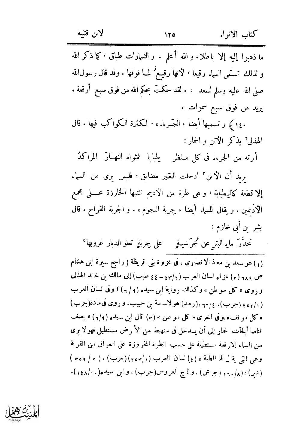140) وتسميها أيضا «الجرباء» ، لكثرة الكواكب فيها. قال الهذلى «2» يذكر الأتن والحمار: