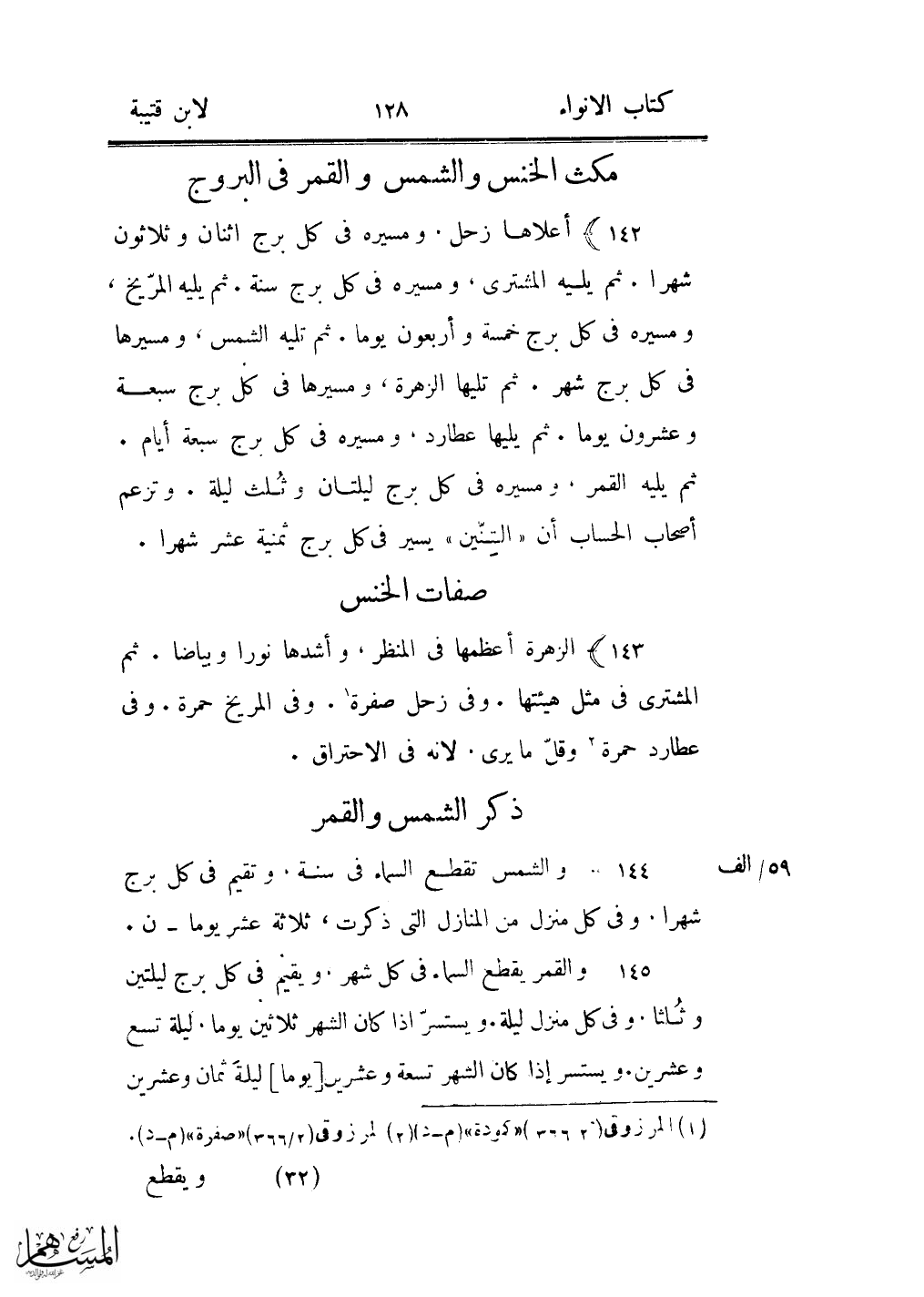 145) والقمر يقطع السماء فى كل شهر، ويقيم فى كل برج ليلتين وثلثا. وفى كل منزل ليلة. ويستسرّ اذا كان الشهر ثلاثين يوما ليلة تسع وعشرين. ويستسر إذا كان الشهر تسعة وعشرين [يوما] ليلة ثمان وعشرين