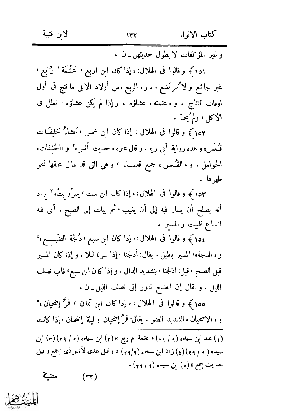 151) وقالوا فى الهلال: «إذا كان ابن اربع، عتمة «1» ربع، غير جائع ولا مرضع» . و «الربع» من أولاد الابل ما نتج فى أول اوقات النتاج. و «عتمته» عشاؤه. وإذا لم يكن عشاؤه، تعلل فى الأكل، ولم يحدّ.