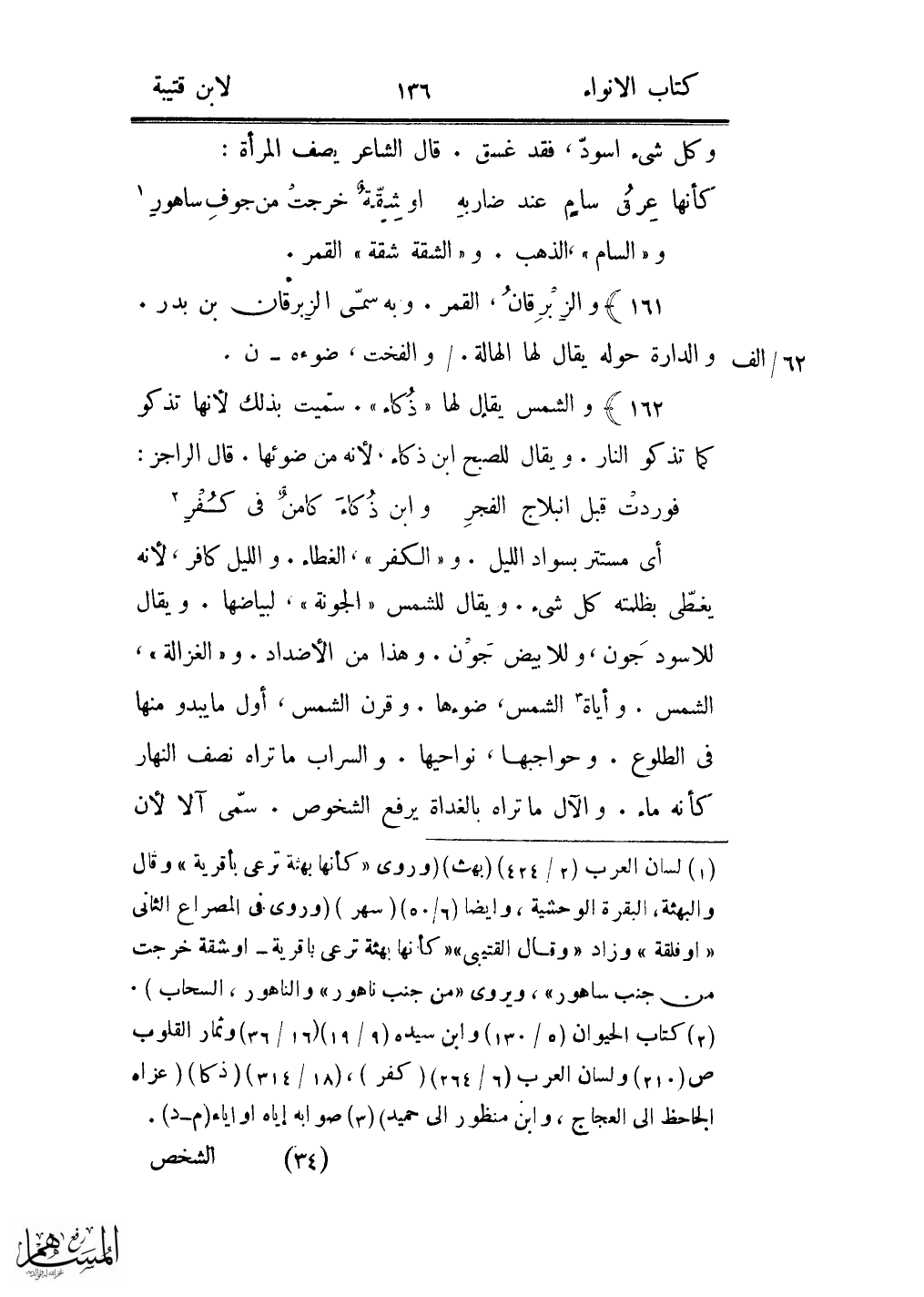 162) والشمس يقال لها «ذكاء» . سمّيت بذلك لأنها تذكو كما تذكو النار. ويقال للصبح ابن ذكاء، لأنه من ضوئها. قال الراجز: