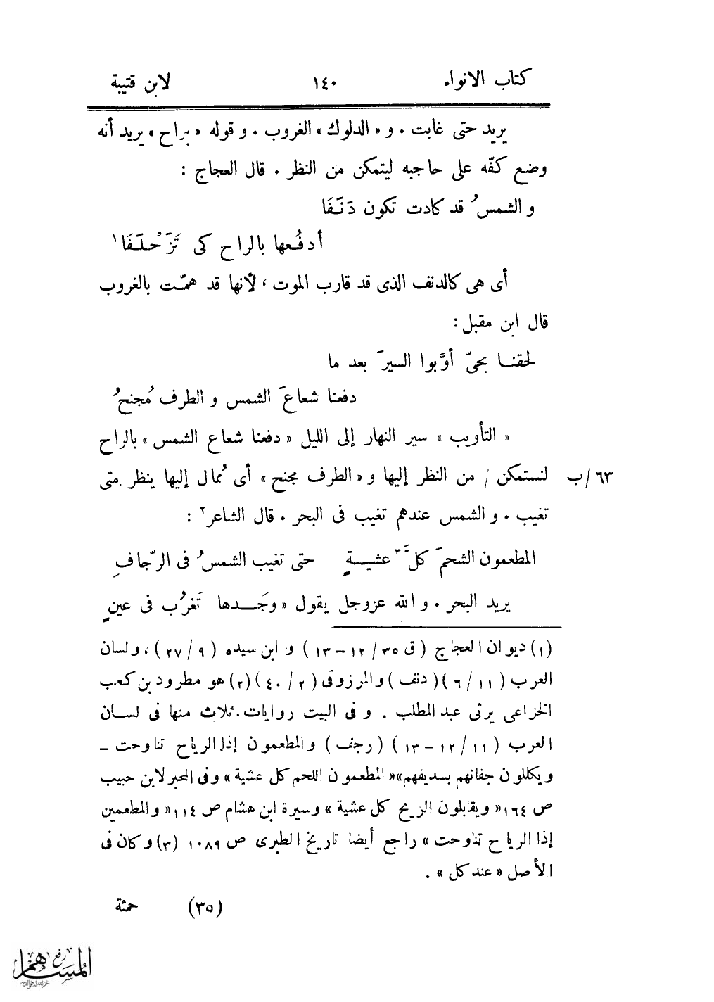 «التأويب» سير النهار إلى الليل «دفعنا شعاع الشمس» بالراح لنستمكن/ من النظر إليها و «الطرف مجنح» أى ممال إليها ينظر متى تغيب. والشمس عندهم تغيب فى البحر. قال الشاعر «2» :