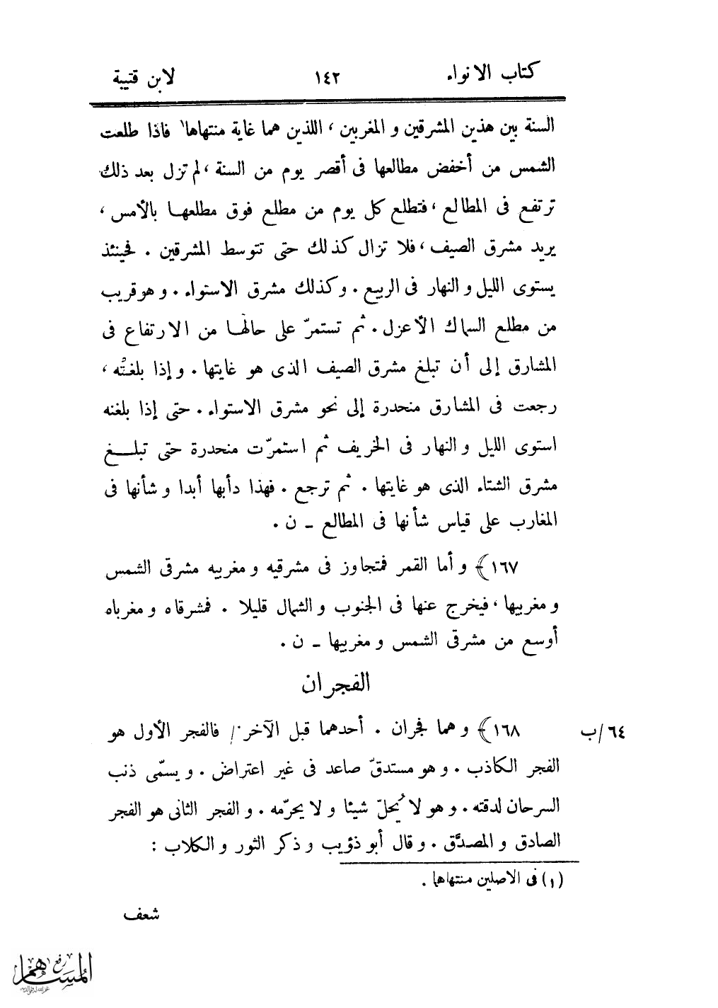 168) وهما فجران. أحدهما قبل الآخر/ فالفجر الأول هو الفجر الكاذب. وهو مستدقّ صاعد فى غير اعتراض. ويسمّى ذنب السرحان لدقته. وهو لا يحلّ شيئا ولا يحرّمه. والفجر الثانى هو الفجر الصادق والمصدّق. وقال أبو ذؤيب وذكر الثور والكلاب: