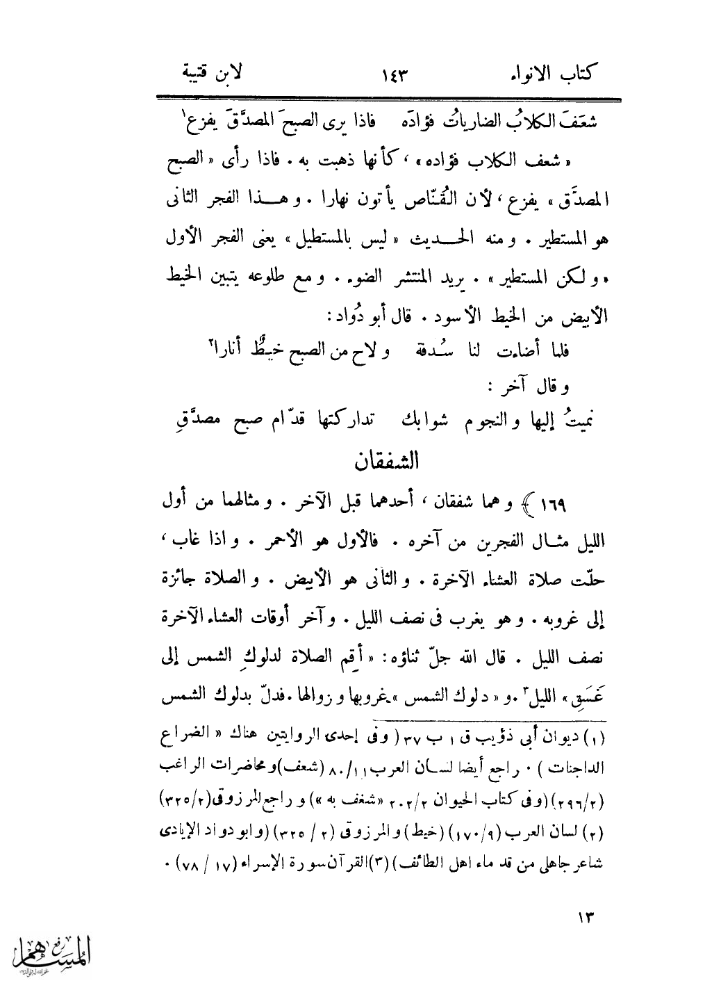 «شعف الكلاب فؤاده» ، كأنها ذهبت به. فاذا رأى «الصبح المصدّق» يفزع، لأن القنّاص يأتون نهارا. وهذا الفجر الثانى هو المستطير. ومنه الحديث «ليس بالمستطيل» يعنى الفجر الأول «ولكن المستطير» . يريد المنتشر الضوء. ومع طلوعه يتبين الخيط الأبيض من الخيط الأسود. قال أبو داود: