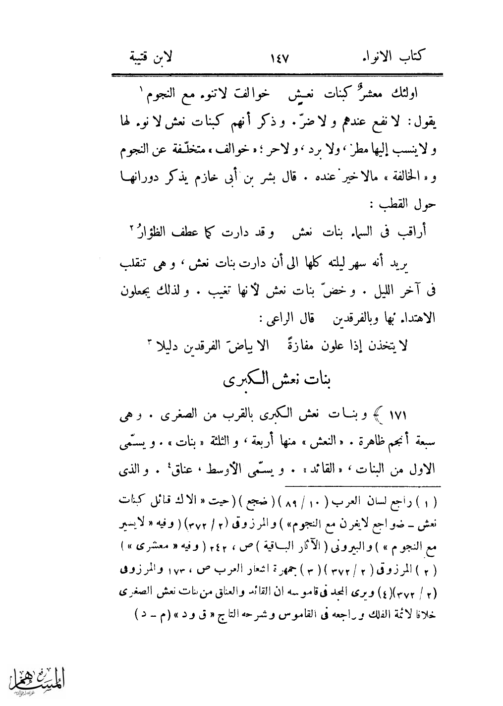 171) وبنات نعش الكبرى بالقرب من الصغرى. وهى سبعة أنجم ظاهرة. «النعش» منها أربعة، والثلثة «بنات» . ويسمّى الاول من البنات، «القائد» . ويسمّى الأوسط، عناق «4» . والذى