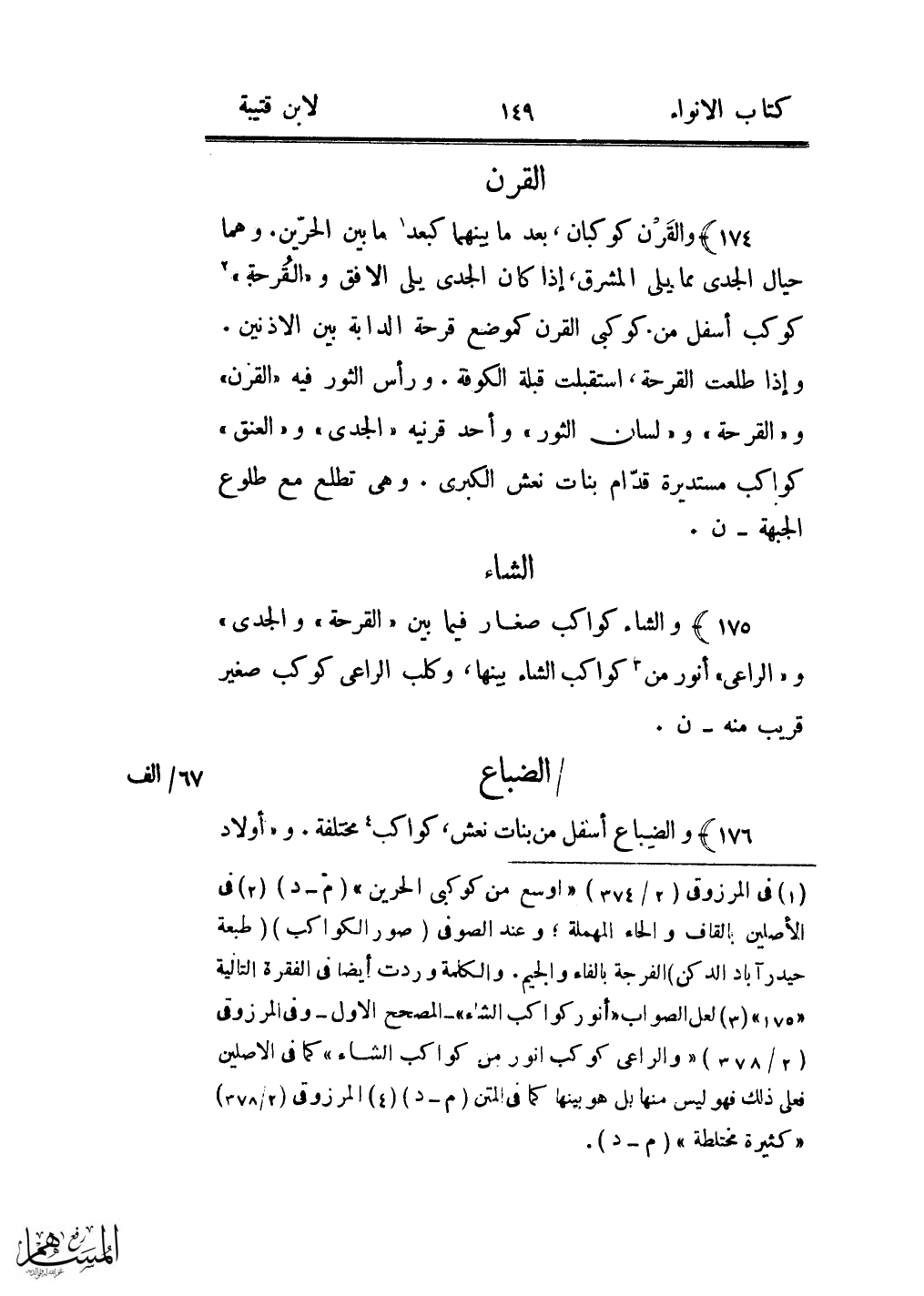 174) والقرن كوكبان، بعد ما بينهما كبعد «1» ما بين الحرّين. وهما حيال الجدى مما يلى المشرق، إذا كان الجدى يلى الافق و «القرحة» «2» كوكب أسفل من. كوكبى القرن كموضع قرحة الدابة بين الاذنين.