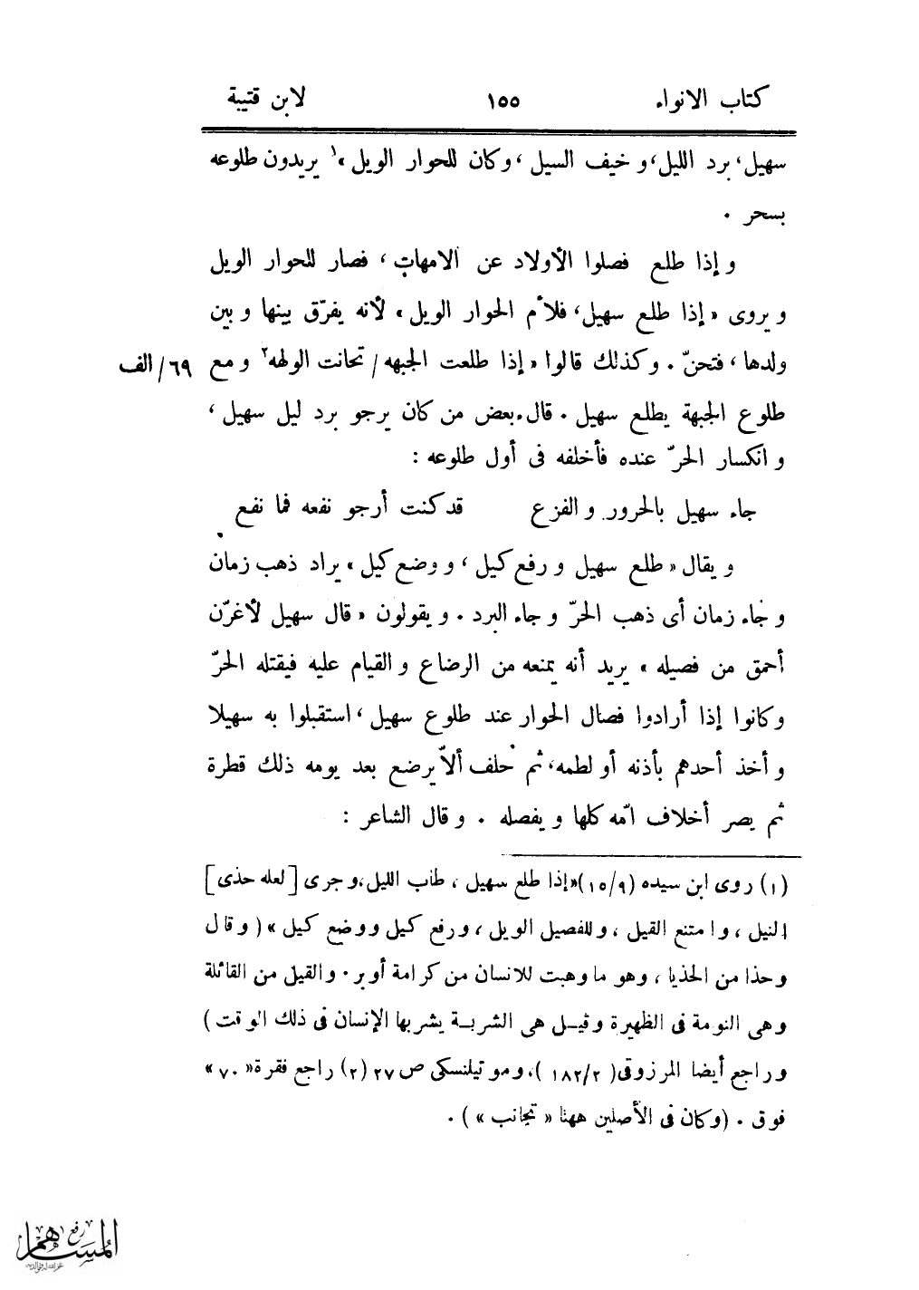 ويقال «طلع سهيل ورفع كيل، ووضع كيل» يراد ذهب زمان وجاء زمان أى ذهب الحرّ وجاء البرد. ويقولون «قال سهيل لأغرّن أحمق من فصيله» يريد أنه يمنعه من الرضاع والقيام عليه فيقتله الحرّ وكانوا إذا أرادوا فصال الحوار عند طلوع سهيل، استقبلوا به سهيلا وأخذ أحدهم بأذنه أو لطمه، ثم حلف ألّا يرضع بعد يومه ذلك قطرة ثم يصر أخلاف امّه كلها ويفصله. وقال الشاعر: