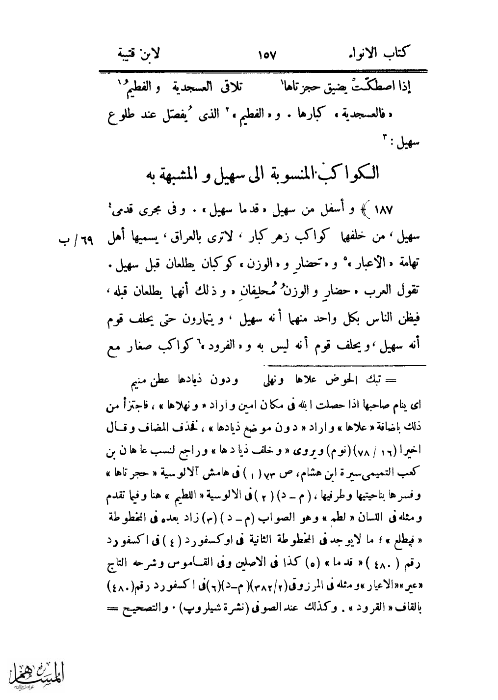 187) وأسفل من سهيل «قدما سهيل» . وفى مجرى قدمى «5» سهيل، من خلفهما كواكب زهر كبار، لا ترى بالعراق، يسميها أهل تهامة «الأعبار» «6» و «حضار و «الوزن» كوكبان يطلعان قبل سهيل.