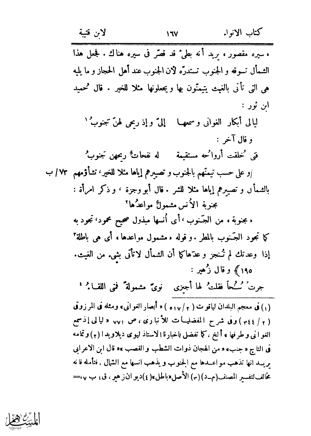 «سيره مقصور» يريد أنه بطئ قد قصّر فى سيره هناك. فجعل هذا الشمأل تسوقه والجنوب تستدرّه لأن الجنوب عند أهل الحجاز وما يليه هى التى تأتى بالغيث يتيمنّون بها ويجعلونها مثلا للخير. قال حميد ابن ثور: