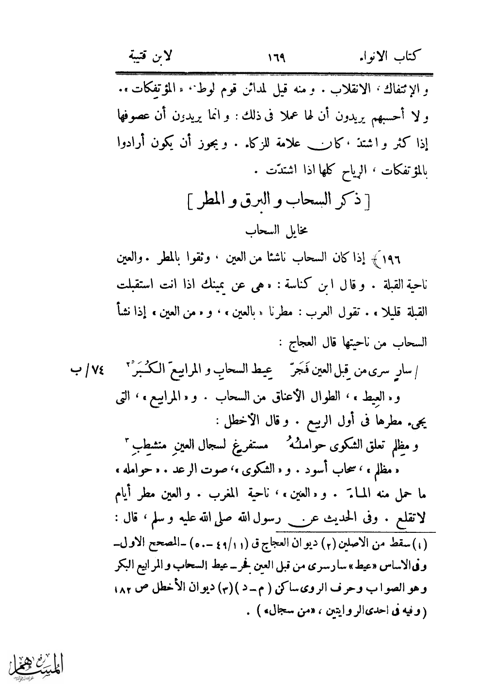 196) إذا كان السحاب ناشئا من العين، وثقوا بالمطر. والعين ناحية القبلة. وقال ابن كناسة: «هى عن يمينك اذا انت استقبلت القبلة قليلا» . تقول العرب: مطرنا «بالعين» ، و «من العين» إذا نشأ السحاب من ناحيتها قال العجاج: