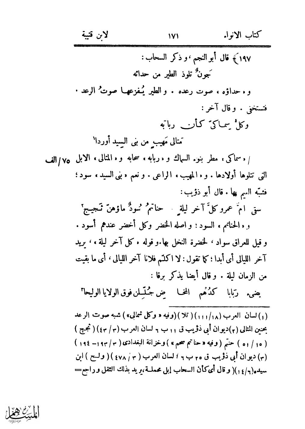 / «سماكى» مطر بنوء السماك و «ربابه» سحابه و «المتالى» الابل التى تتلوها أولادها. و «المهيب» الراعى. ونعم «بنى السيد» سود؛ فشبّه العيم بها. قال أبو ذؤيب: