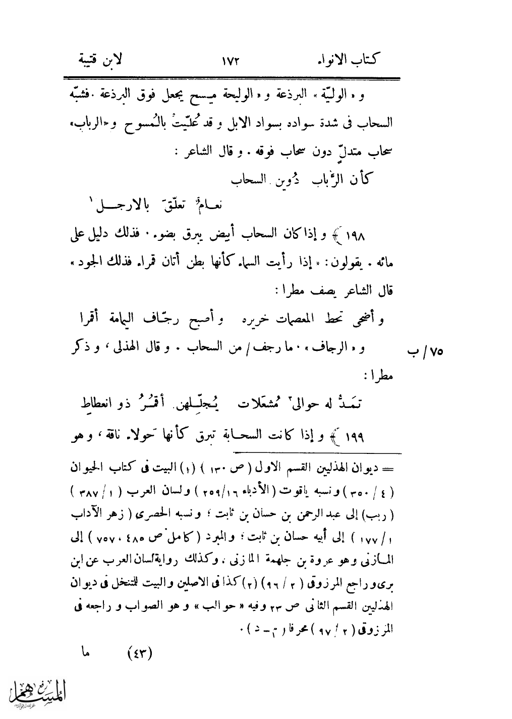 198) وإذا كان السحاب أبيض يبرق بضوء. فذلك دليل على مائه. يقولون: «إذا رأيت السماء كأنها بطن أتان قمراء فذلك الجود» قال الشاعر يصف مطرا: