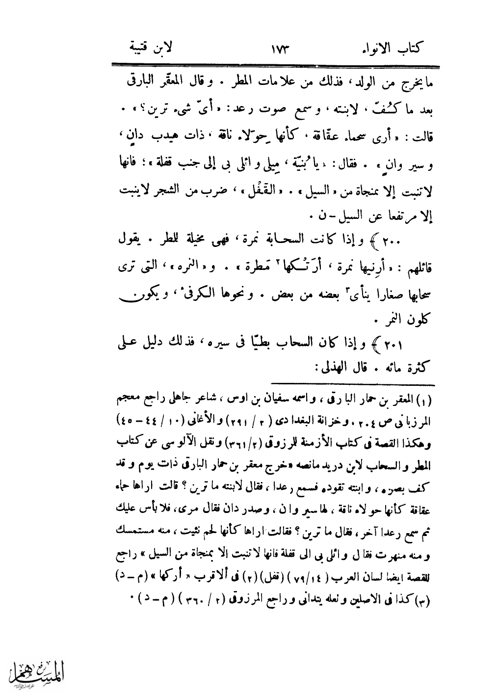 200) وإذا كانت السحابة نمرة، فهى مخيلة للمطر. يقول قائلهم: «أرنيها نمرة، أرتكها «2» مطرة» . و «النمره» ، التى ترى سحابها صغارا ينأى «3» بعضه من بعض. ونحوها الكرفىء، ويكون كلون النمر.