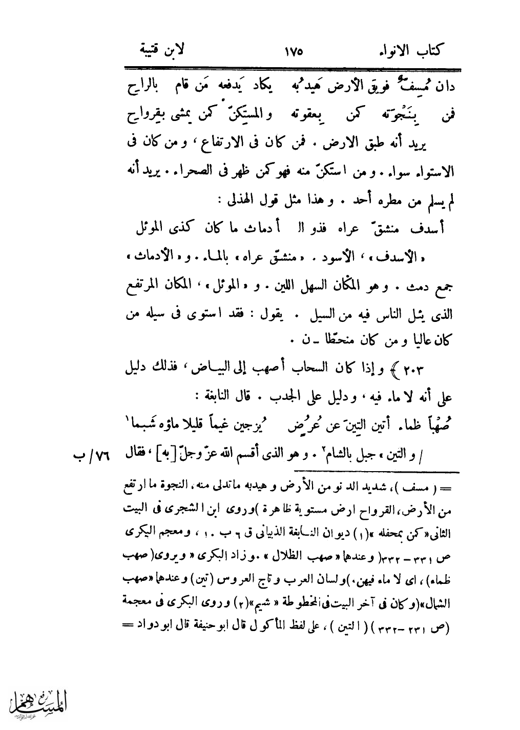 «الأسدف» ، الأسود. «منشّق عراه» بالماء. و «الأدماث» جمع دمث. وهو المكان السهل اللين. و «الموئل» ، المكان المرتفع الذى يئل الناس فيه من السيل. يقول: فقد استوى فى سيله من كان عاليا ومن كان منحطّا- ن.