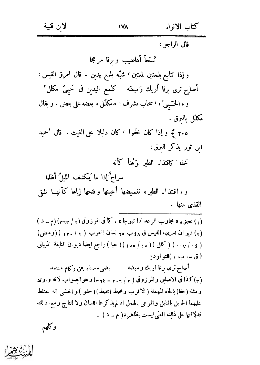 205) وإذا كان خفوا، كان دليلا على الغيث. قال حميد ابن ثور يذكر البرق:
