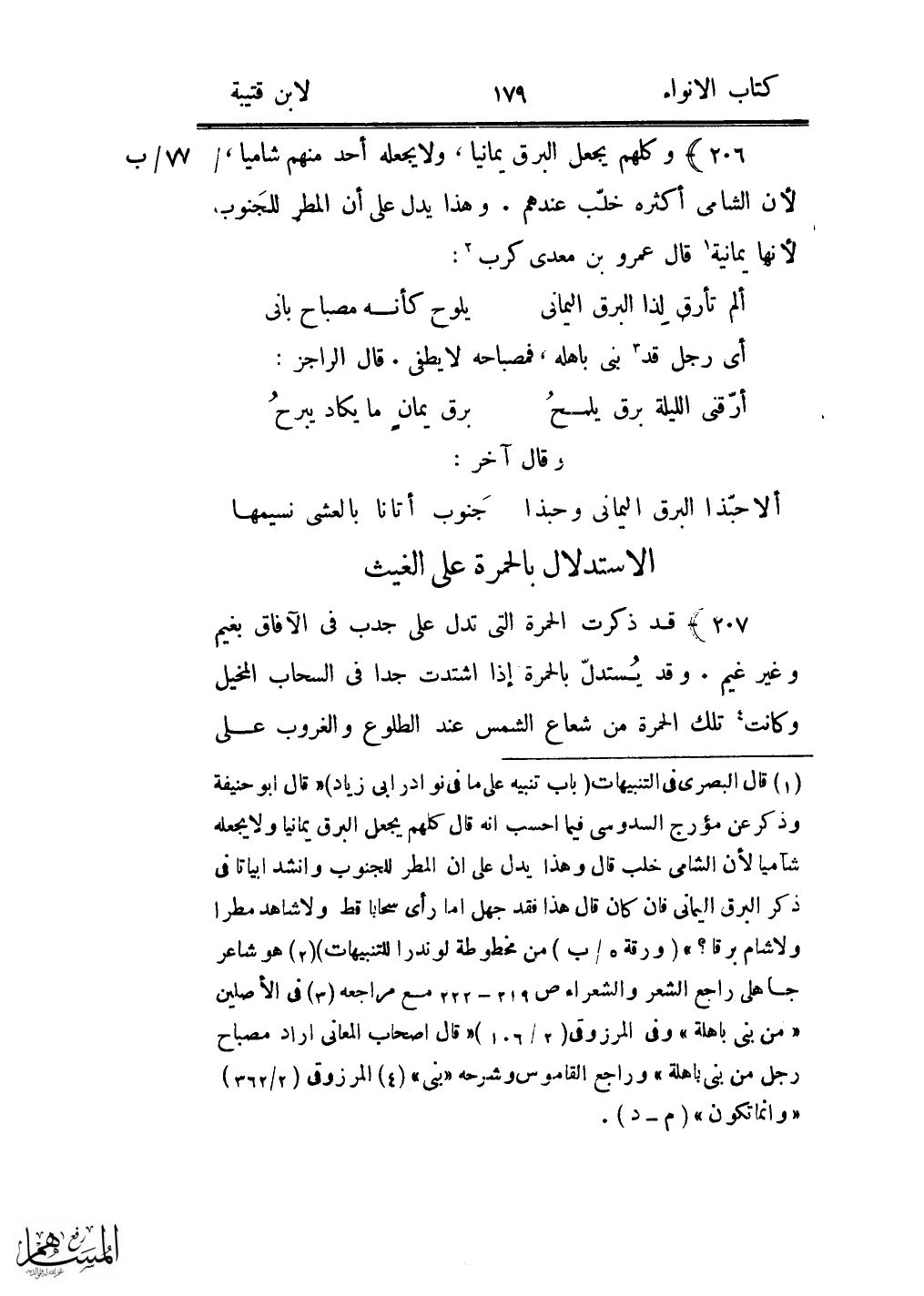 206) وكلهم يجعل البرق يمانيا، ولا يجعله أحد منهم شاميا، / لأن الشامى أكثره خلّب عندهم. وهذا يدل على أن المطر للجنوب لأنها يمانية «1» قال عمرو بن معدى كرب «2» :