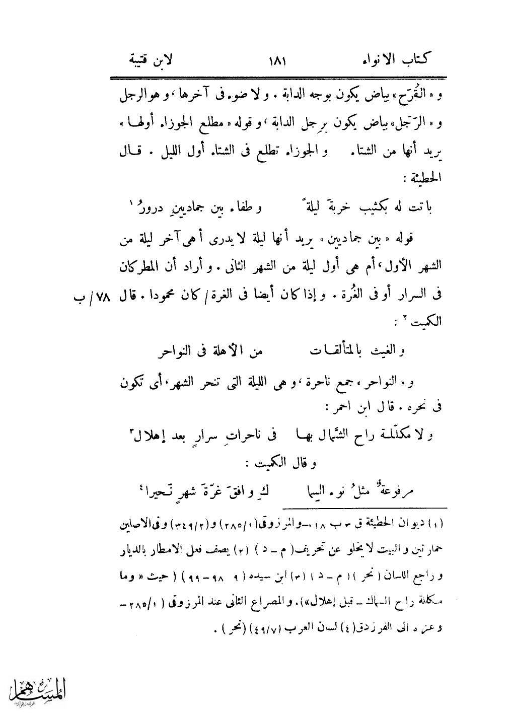 و «القرح» بياض يكون بوجه الدابة. ولا ضوء فى آخرها، وهو الرجل و «الرجل» بياض يكون برجل الدابة، وقوله «مطلع الجوزاء أولها» يريد أنها من الشتاء والجوزاء تطلع فى الشتاء أول الليل. قال الحطيئة: