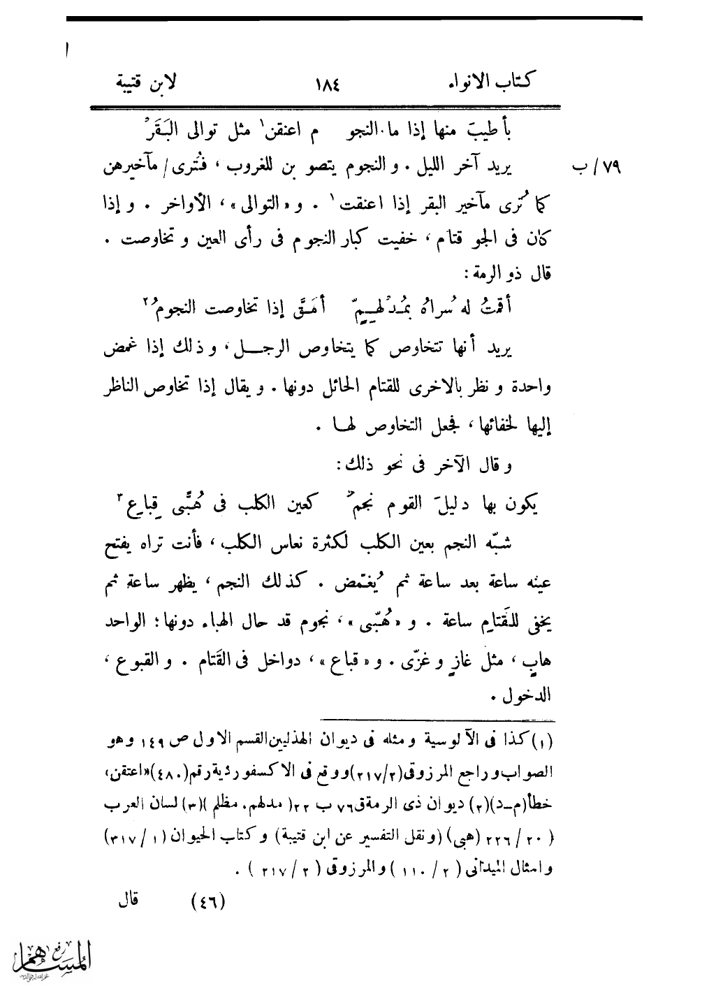 شبّه النجم بعين الكلب لكثرة نعاس الكلب، فأنت تراه يفتح عينه ساعة بعد ساعة ثم يغمّض. كذلك النجم، يظهر ساعة ثم يخفى للقتام ساعة. و «هبّى» ، نجوم قد حال الهباء دونها؛ الواحد هاب، مثل غاز وغزّى. و «قباع» ، دواخل فى القتام. والقبوع، الدخول.