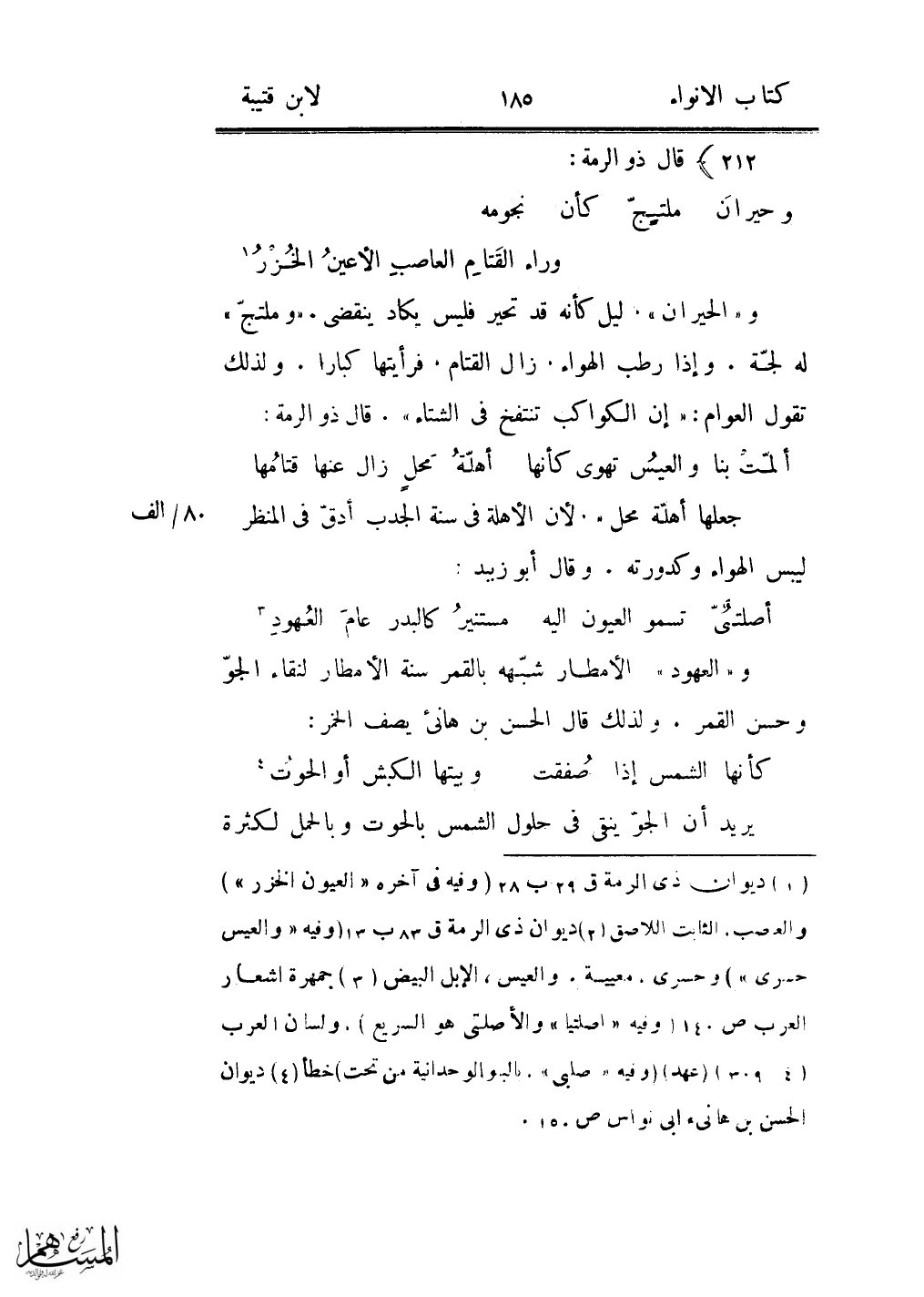 و «العهود» الأمطار شبّهه بالقمر سنة الأمطار لنقاء الجوّ وحسن القمر. ولذلك قال الحسن بن هانئ يصف الخمر: