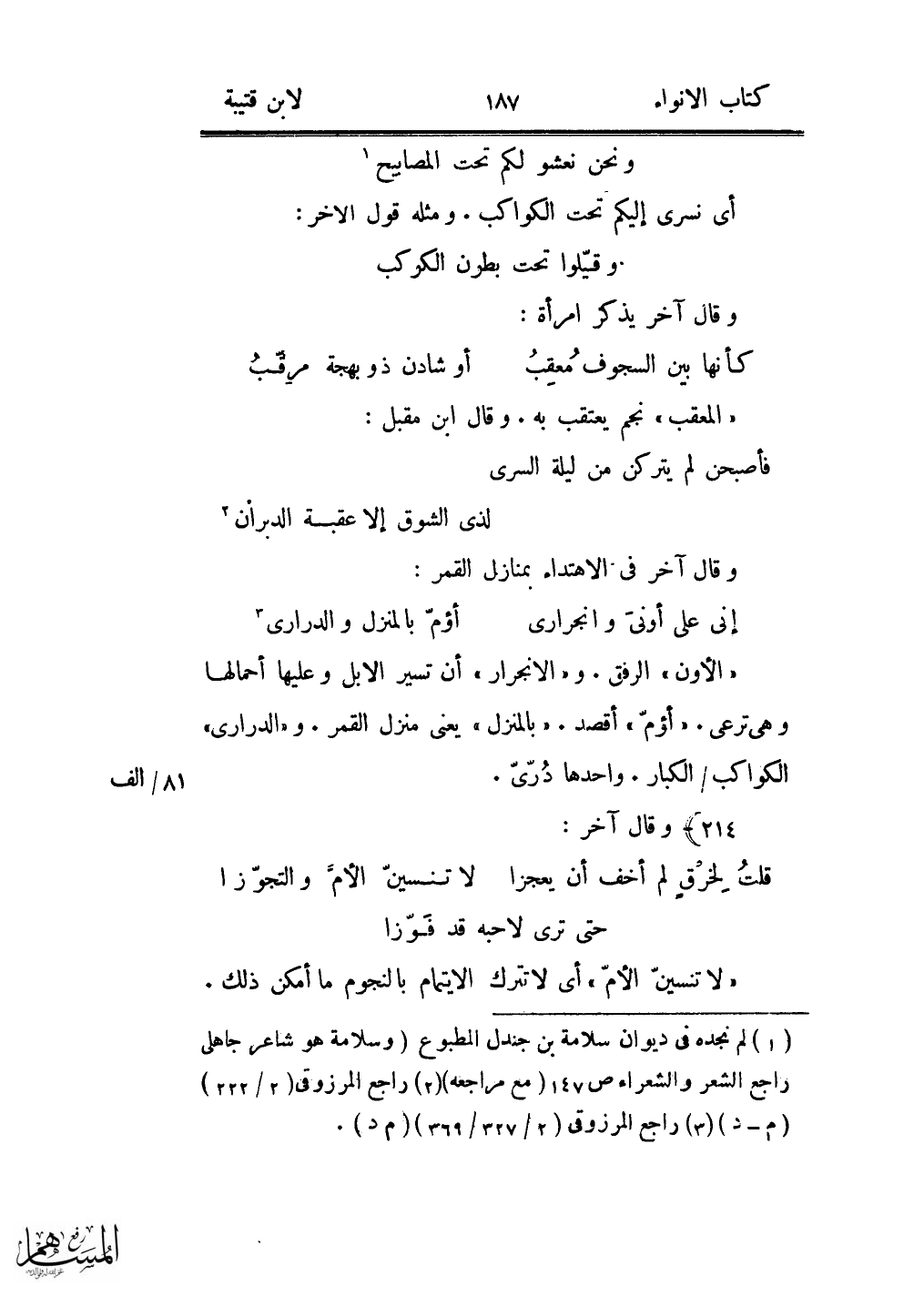 «الأون» الرفق. و «الانجرار» أن تسير الابل وعليها أحمالها وهى ترعى. «أؤمّ» أقصد. «بالمنزل» يعنى منزل القمر. و «الدرارى» الكواكب/ الكبار. واحدها درّىّ.