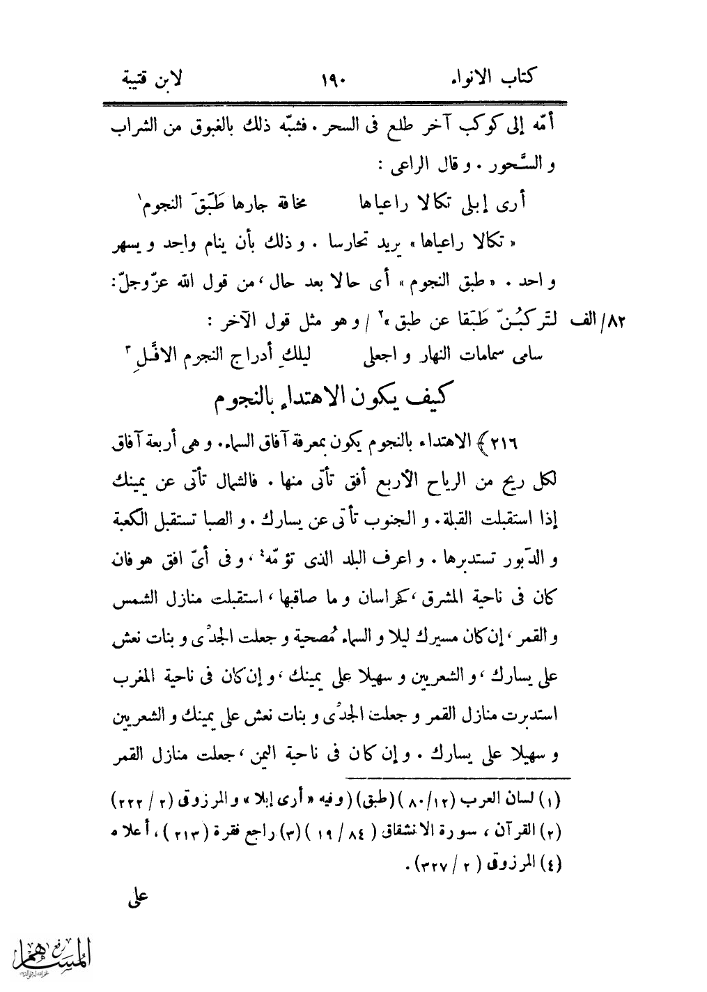 216) الاهتداء بالنجوم يكون بمعرفة آفاق السماء. وهى أربعة آفاق لكل ريح من الرياح الأربع أفق تأتى منها. فالشمال تأتى عن يمينك إذا استقبلت القبلة. والجنوب تأتى عن يسارك. والصبا تستقبل الكعبة والدبور تستدبرها. واعرف البلد الذى تؤمّه، «4» وفى أىّ افق هو فان كان فى ناحية المشرق، كخراسان وما صاقبها، استقبلت منازل الشمس والقمر، إن كان مسيرك ليلا والسماء مصحية وجعلت الجدى وبنات نعش على يسارك، والشعريين وسهيلا على يمينك، وإن كان فى ناحية المغرب استدبرت منازل القمر وجعلت الجدى وبنات نعش على يمينك والشعريين وسهيلا على يسارك. وإن كان فى ناحية اليمن، جعلت منازل القمر