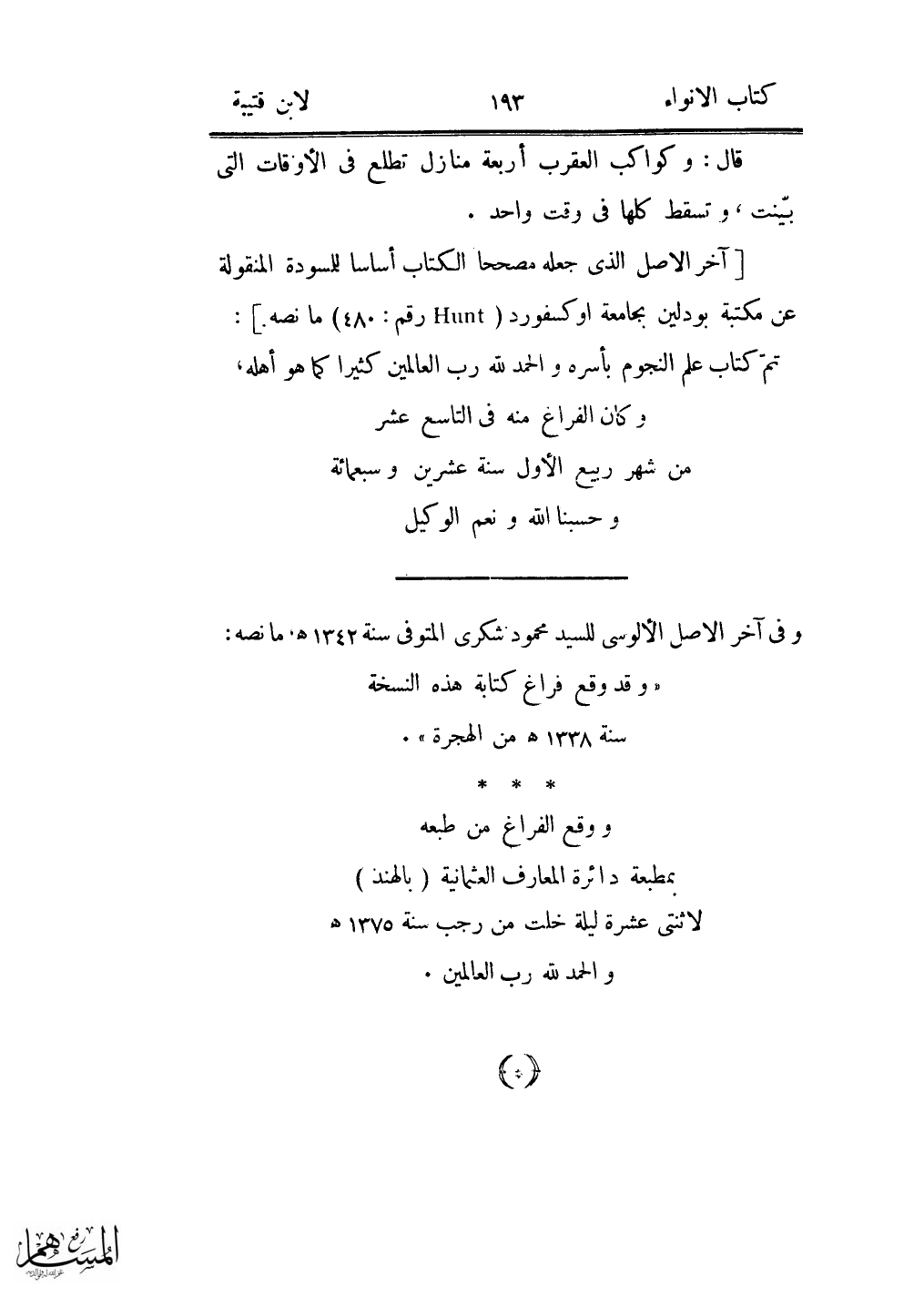 تمّ كتاب علم النجوم بأسره والحمد لله رب العالمين كثيرا كما هو أهله، وكان الفراغ منه فى التاسع عشر من شهر ربيع الأول سنة عشرين وسبعمائة وحسبنا الله ونعم الوكيل وفى آخر الاصل الألوسى للسيد محمود شكرى المتوفى سنة 1342 هـ-، ما نصه: