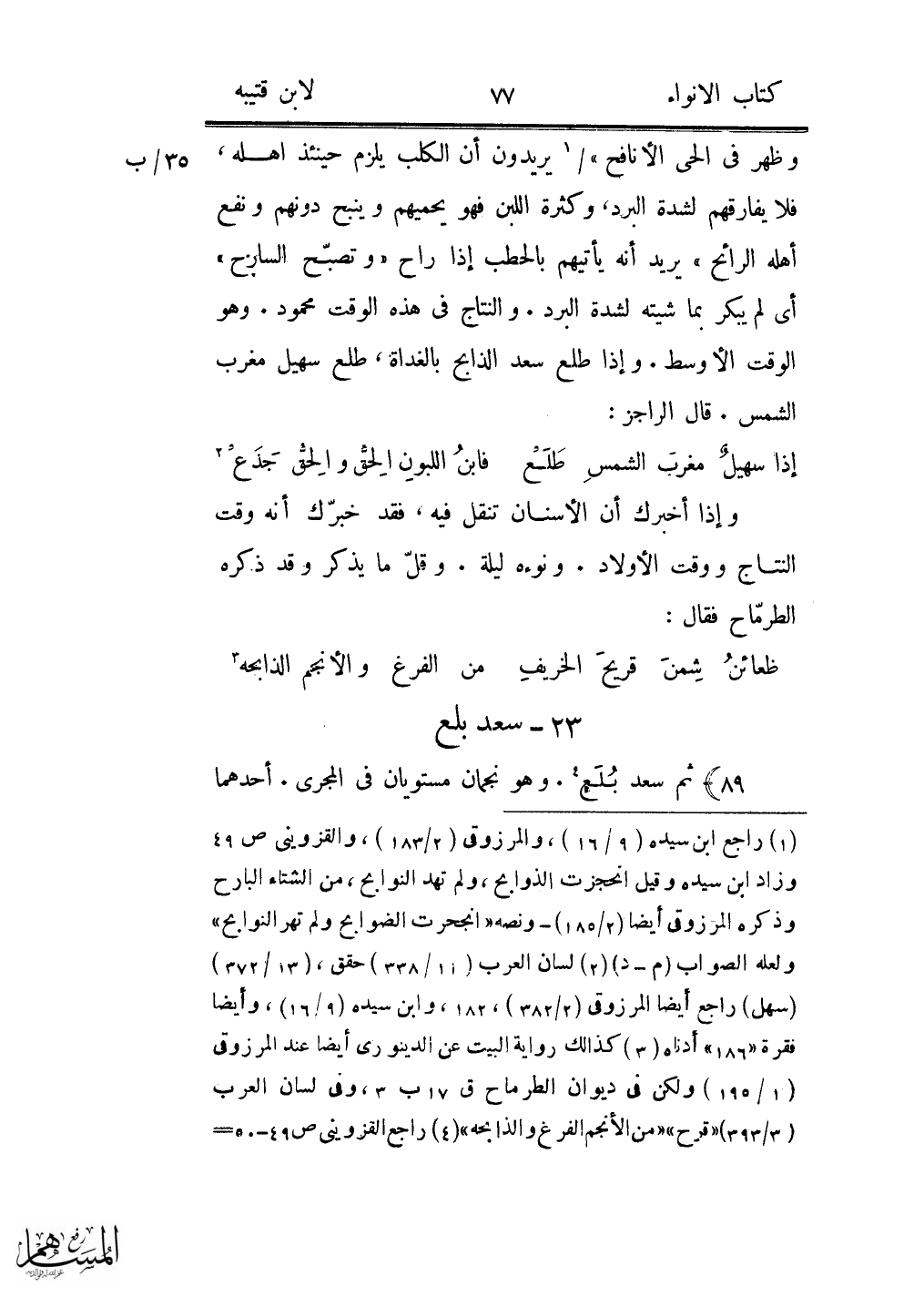 وظهر فى الحى الأنافح» / «1» يريدون أن الكلب يلزم حينئذ اهله، فلا يفارقهم لشدة البرد، وكثرة اللبن فهو يحميهم وينبح دونهم ونفع أهله الرائح» يريد أنه يأتيهم بالحطب إذا راح «وتصبّح السازج» أى لم يبكر بما شيته لشدة البرد. والنتاج فى هذه الوقت محمود. وهو الوقت الأوسط. وإذا طلع سعد الذابح بالغداة، طلع سهيل مغرب الشمس. قال الراجز: