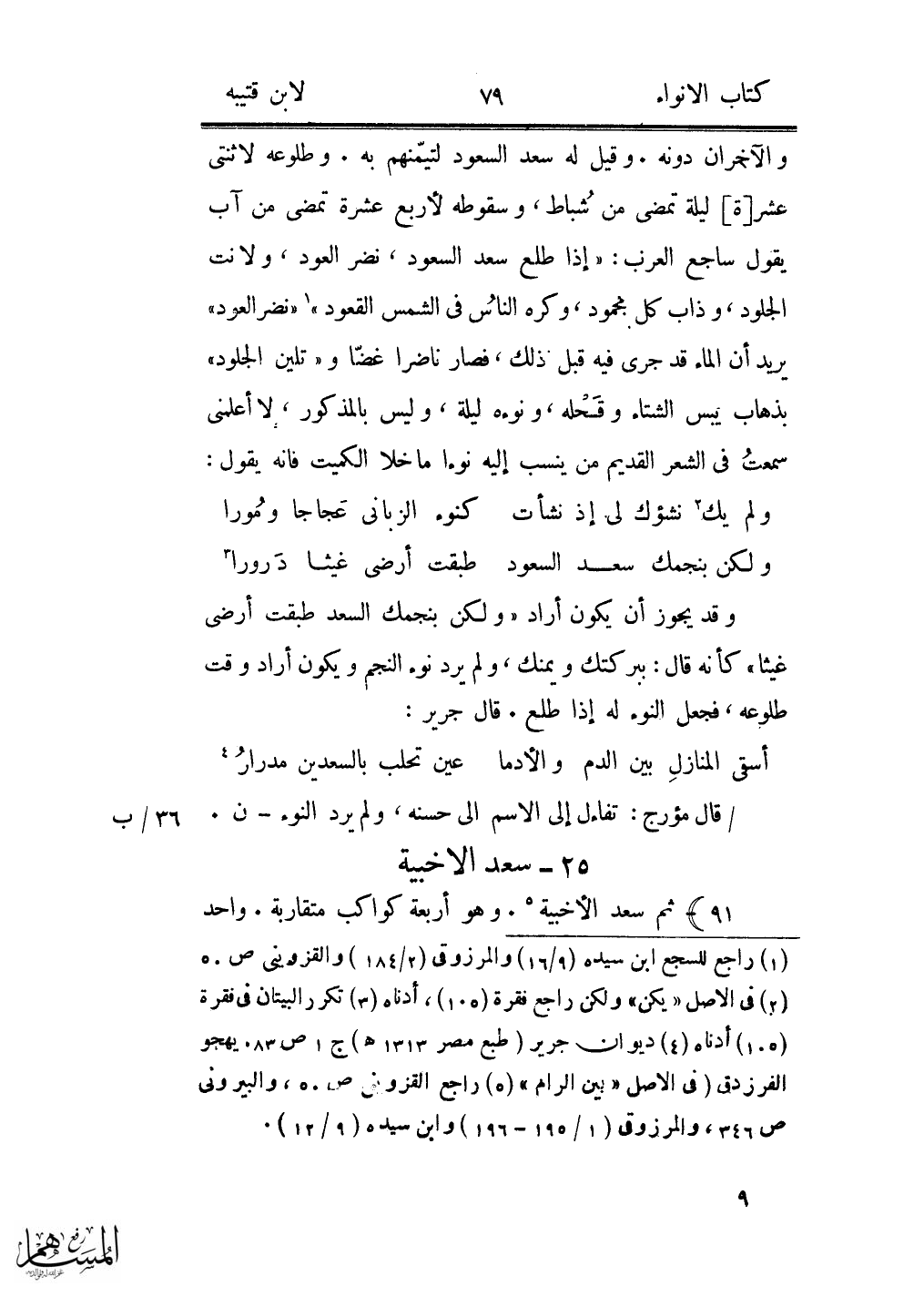 والآخران دونه. وقيل له سعد السعود لتيّمنهم به. وطلوعه لاثنتى عشر [ة] ليلة تمضى من شباط، وسقوطه لأربع عشرة تمضى من آب يقول ساجع العرب: «إذا طلع سعد السعود، نضر العود، ولانت الجلود، وذاب كل محمود، وكره الناس فى الشمس القعود» «1» «نضر العود» يريد أن الماء قد جرى فيه قبل ذلك، فصار ناضرا غضّا و «تلين الجلود» بذهاب يبس الشتاء وقحله، ونوءه ليلة، وليس بالمذكور، لا أعلمنى سمعت فى الشعر القديم من ينسب إليه نوءا ما خلا الكميت فانه يقول: