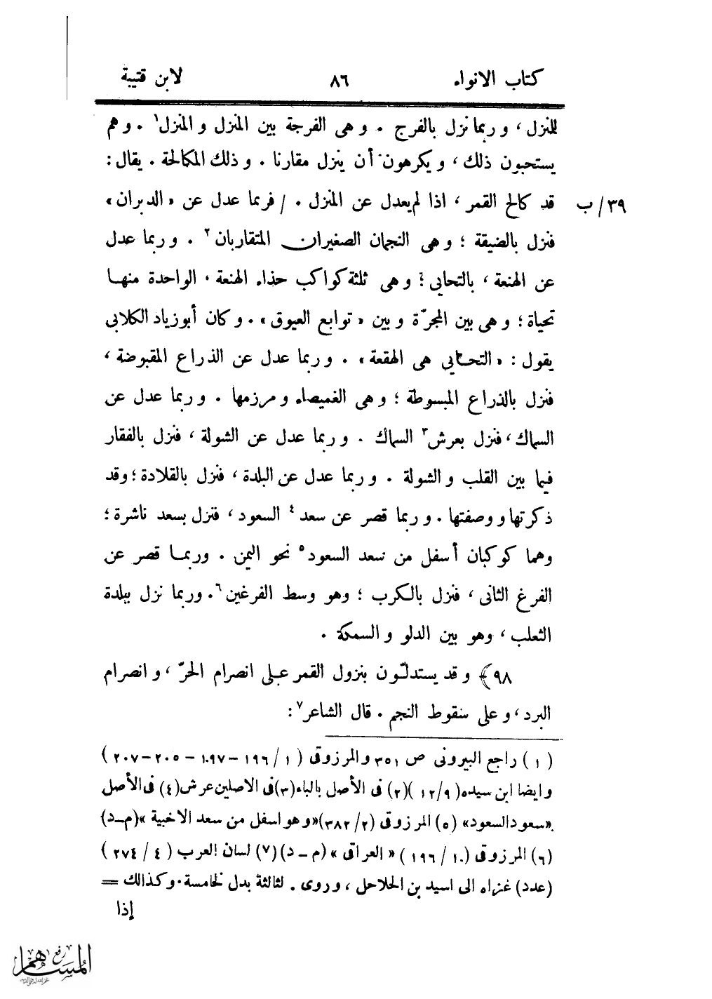 98) وقد يستدلّون بنزول القمر على انصرام الحرّ، وانصرام البرد، وعلى سقوط النجم. قال الشاعر «7» :
