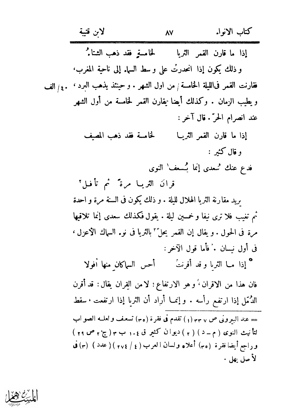 وذلك يكون إذا انحدرت على وسط السماء إلى ناحية المغرب، فقارنت القمر فى الليلة الخامسة/ من اول الشهر. وحينئذ يذهب البرد، ويطيب الزمان. وكذلك أيضا يقارن القمر لخامسة من أول الشهر عند انصرام الحرّ. قال آخر: