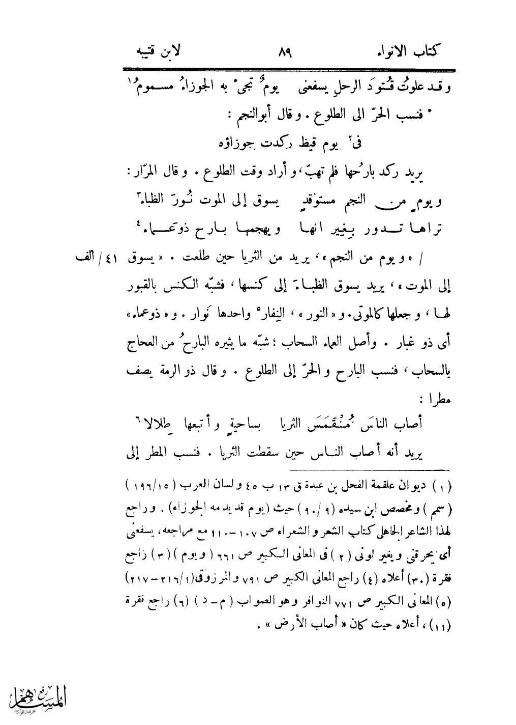 / «ويوم من النجم» ، يريد من الثريا حين طلعت. «يسوق إلى الموت» ، يريد يسوق الظباء إلى كنسها، فشبّه الكنس بالقبور لها، وجعلها كالموتى. و «النور» ، النفار «5» واحدها نوار. و «ذوعماء» أى ذو غبار. وأصل العماء السحاب؛ شبّه ما يثيره البارح من العجاج بالسحاب، فنسب البارح والحرّ إلى الطلوع. وقال ذو الرمة يصف مطرا: