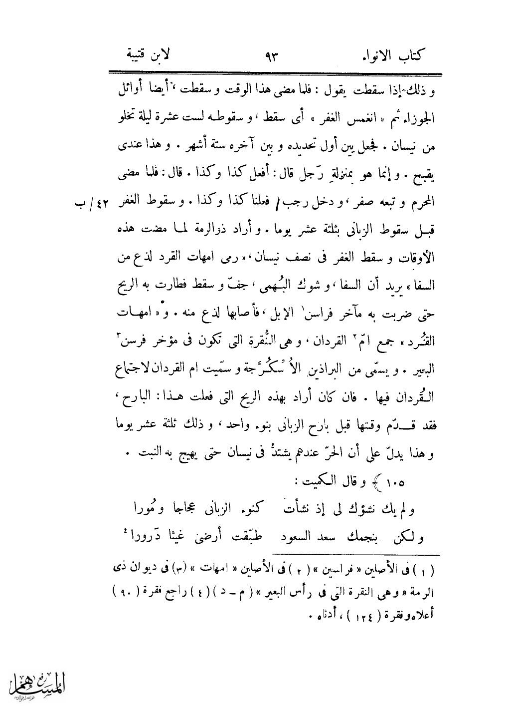 وذلك. إذا سقطت يقول: فلما مضى هذا الوقت وسقطت، أيضا أوائل الجوزاء ثم «انغمس الغفر» أى سقط، وسقوطه لست عشرة ليلة تخلو من نيسان. فجعل بين أول تحديده وبين آخره ستة أشهر. وهذا عندى يقبح. وإنما هو بمنزلة رجل قال: أفعل كذا وكذا. قال: فلما مضى المحرم وتبعه صفر، ودخل رجب/ فعلنا كذا وكذا. وسقوط الغفر قبل سقوط الزبانى بثلثة عشر يوما. وأراد ذو الرمة لما مضت هذه الأوقات وسقط الغفر فى نصف نيسان، «رمى امهات القرد لذع من السفا» يريد أن السفا، وشوك البهمى، جفّ وسقط فطارت به الريح حتى ضربت به مآخر فراسن «1» الإبل، فأصابها لذع منه. و «امهات القرد» جمع امّ «2» القردان، وهى النّقرة التى تكون فى مؤخر فرسن «3» البعير. ويسمّى من البراذين الاسكرّجة وسمّيت ام القردان لاجتماع القردان فيها. فان كان أراد بهذه الريح التى فعلت هذا: البارح، فقد قدّم وقتها قبل بارح الزبانى بنوء واحد، وذلك ثلثة عشر يوما وهذا يدلّ على أن الحرّ عندهم يشتدّ فى نيسان حتى يهيج به النبت.