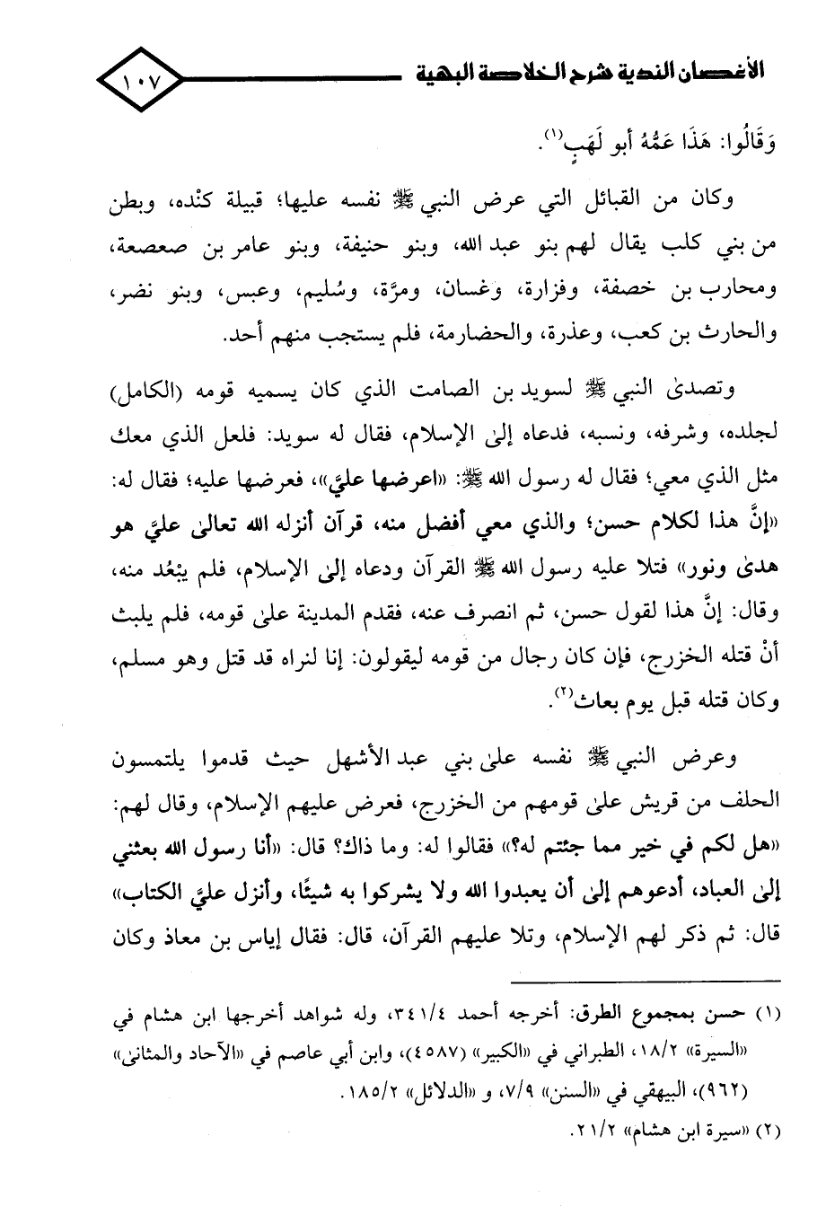 وتصدى النبي -صلى الله عليه وسلم- لسويد بن الصامت الذي كان يسميه قومه (الكامل) لجلده، وشرفه، ونسبه، فدعاه إلى الإِسلام، فقال له سويد: فلعل الذي معك مثل الذي معي؛ فقال له رسول الله -صلى الله عليه وسلم-: "اعرضها عليّ"، فعرضها عليه؛ فقال له: "إنَّ هذا لكلام حسن؛ والذي معي أفضل منه، قرآن أنزله الله تعالى عليَّ هو هدى ونور" فتلا عليه رسول الله -صلى الله عليه وسلم- القرآن ودعاه إلى الإِسلام، فلم يبْعُد منه، وقال: إنَّ هذا لقول حسن، ثم انصرف عنه، فقدم المدينة علي قومه، فلم يلبث أنْ قتله الخزرج، فإن كان رجال من قومه ليقولون: إنا لنراه قد قتل وهو مسلم، وكان قتله قبل يوم بعاث (¬2).