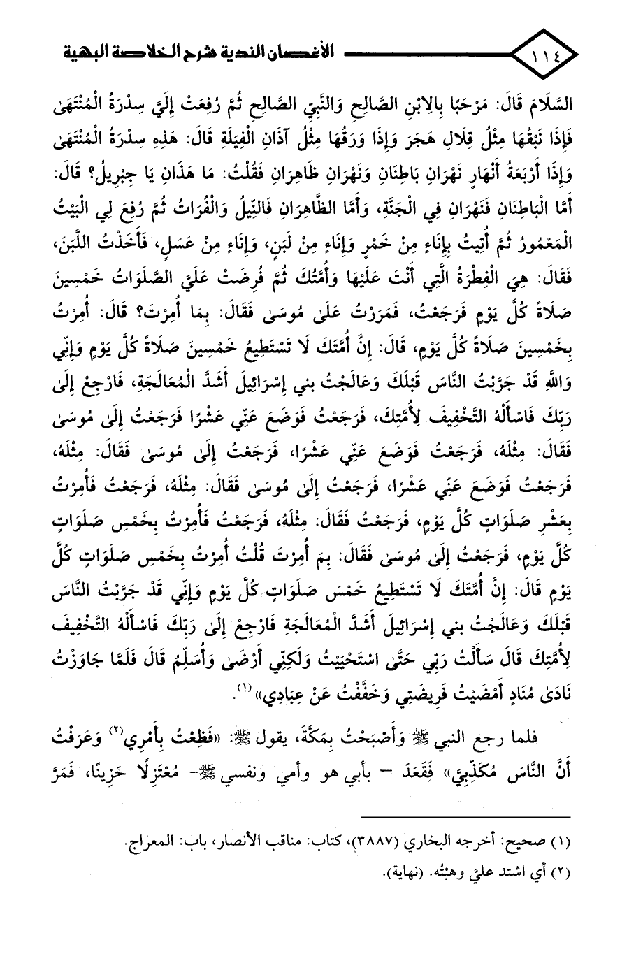 السَّلامَ قالَ: مَرحَبًا بِالِابْنِ الصّالِحِ والنَّبِي الصّالِحِ ثُمَّ رُفِعَتْ إِلَيَ سِدرَةُ الْمُنْتَهَى فَإذا نَبْقُها مِثْلُ قِلالِ هَجَرَ وَإِذا وَرَقُها مِثْلُ آذانِ الْفِيَلَةِ قالَ: هَذهِ سِدرَةُ الْمُنْتَهَى وإِذا أَرْبَعَةُ أَنْهارٍ نَهْرانِ باطِنانِ وَنَهْرانِ ظاهِرانِ فَقُلْتُ: ما هَذانِ يا جِبْرِيلُ؟ قالَ: أَمّا الْباطِنانِ فَنَهْرانِ في الْجَنة، وَأَمّا الظّاهِرانِ فالنِّيلُ والْفُراتُ ثُمَّ رُفِعَ لِي الْبَيْتُ الْمَعْمُورُ ثمَّ أُتِيتُ بِإناءٍ مِنْ خَمْرٍ وَإِناءٍ مِنْ لَبَنٍ، وَإِناءٍ مِنْ عَسَلٍ، فأَخَذْتُ اللَّبَنَ، فَقالَ: هِيَ الْفِطْرَةُ الَّتِي أَنْتَ عَلَيْها وَأُمَّتُكَ ثُمَّ فُرِضَتْ عَلَيَّ الصَّلَواتُ خَمْسِينَ صَلاةً كُلَّ يَوْمٍ فَرَجَعْتُ، فَمَرَرْتُ عَلَى مُوسَى فَقالَ: بِما أُمِرْتَ؟ قالَ: أُمِرْتُ بِخَمْسِينَ صَلاةً كُل يَوْمٍ، قالَ: إِنَّ أُمَّتَكَ لا تَسْتَطِيعُ خَمْسِينَ صَلاةً كُلَّ يَوْمٍ وَإِنِّي واللهِ قَدْ جَرَّبْتُ النّاسَ قَبْلَكَ وَعالَجْتُ بني إِسْرائِيلَ أَشَدَّ الْمُعالَجَةِ، فارْجِعْ إلى رَبِّكَ فاسْأَلْهُ التَّخْفِيفَ لِأُمَّتِكَ، فَرَجَعْتُ فَوَضَعَ عَنِّي عَشْرًا فَرَجَعْتُ إِلَى مُوسَى فَقالَ: مِثْلَهُ، فَرَجَعْتُ فَوَضَعَ عَنِّي عَشْرًا، فَرَجَعْتُ إلى مُوسَى فَقالَ: مِثْلَهُ، فَرَجَعْتُ فَوَضَعَ عَنِّي عَشْرًا، فَرَجَعْتُ إلى مُوسَى فَقالَ: مِثْلَهُ فَرَجَعْتُ فأُمِرتُ بِعَشْرِ صَلَواتٍ كُلَّ يَوْمٍ، فَرَجَعْتُ فَقالَ: مِثْلَه فَرَجَعْتُ فأُمِرتُ بِخَمْسِ صَلَواتٍ كُلَّ يَوْمٍ، فَرَجَعْتُ إلى مُوسَى فَقالَ: بِمَ أُمرْتَ قُلْتُ أُمِرْتُ بِخَمْسِ صَلَواتٍ كُلَّ يَوْمٍ قالَ: إِنَّ أُمَّتَكَ لا تَسْتَطِيعُ خَمْسَ صَلَواتٍ كُلَّ يَوْمٍ وَإِنِّي قَدْ جَرَّبْتُ النّاسَ قَبْلَكَ وَعالَجْتُ بني إِسْرائِيلَ أَشَدَّ الْمُعالَجَةِ فارْجِعْ إِلَى رَبِّكَ فاسْألْهُ التَّخْفِيفَ لِأُمَّتِكَ قالَ سأَلْتُ رَبِّي حَتَّى اسْتَحيَيْتُ وَلَكِنِّي أَرْضَى وَأُسَلِّمُ قالَ فَلَمّا جاوَزْتُ نادَى مُنادٍ أَمْضَيْتُ فَرِيضَتِي وَخَفَّفْتُ عَنْ عِبادِي" (¬1).