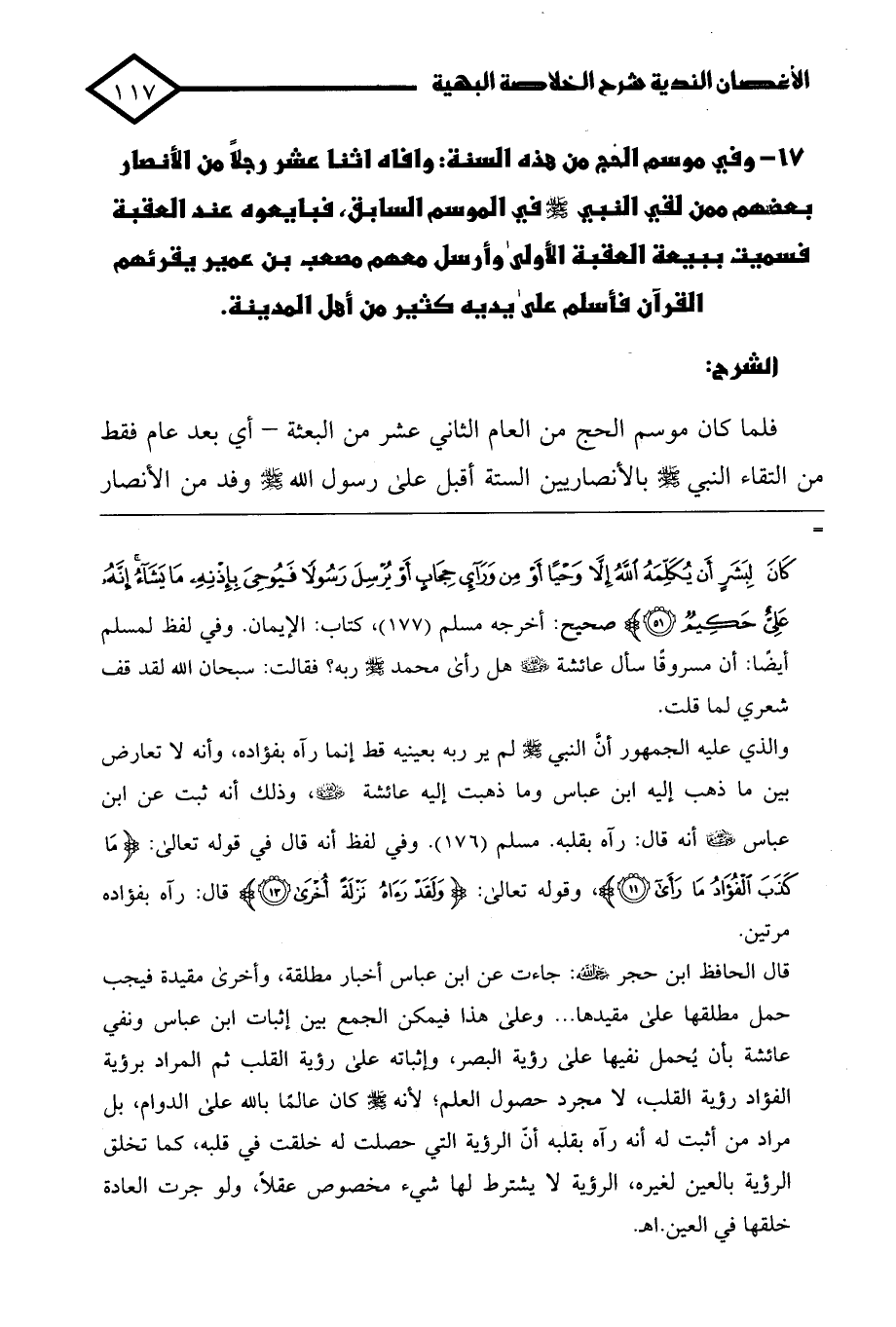 17 - وفي موسم الحج من هذه السنة: وافاه اثنا عشر رجلاً من الأنصار بعضهم ممن لقي النبي - صلى الله عليه وسلم - في الموسم السابق، فبايعوه عند العقبة فسميت ببيعة العقبة الأولى وأرسل معهم مصعب بن عمير يقرئهم القرآن فأسلم على يديه كثير من أهل المدينة.