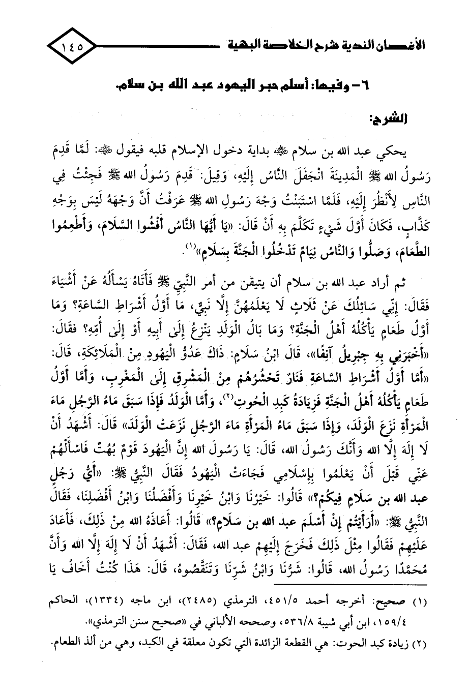 ثم أراد عبد الله بن سلام أن يتيقن من أمر النَّبِيّ - صلى الله عليه وسلم - فَأَتَاهُ يَسْأَلُهُ عَنْ أَشْيَاءَ فَقَالَ: إِنِّي سَائِلُكَ عَنْ ثَلَاثٍ لَا يَعْلَمُهُنَّ إِلَّا نَبِيٌّ، مَا أَوَّلُ أَشْرَاطِ السَّاعَةِ؟ وَمَا أَوَّلُ طَعَامٍ يَأْكُلُهُ أَهْلُ الْجَنَّةِ؟ وَمَا بَالُ الْوَلَدِ يَنْزعُ إلى أَبِيهِ أَوْ إلى أُمِّهِ؟ فقَالَ: "أَخْبَرَنِي بِهِ جِبْرِيلُ آنِفًا"، قَالَ ابْنُ سَلَامٍ: ذَاكَ عَدُوُّ الْيَهُودِ مِنْ الْمَلَائِكَةِ، قَالَ: "أَمَّا أَوَّلُ أَشْرَاطِ السَّاعَةِ فَنَارٌ تَحْشُرُهُمْ مِنْ الْمَشْرِقِ إلى الْمَغْرِبِ، وَأَمَّا أَوَّلُ طَعَامٍ يَأْكلُهُ أَهْلُ الْجَنَّةِ فَزِيَادَةُ كَبِدِ الْحُوتِ (¬2)، وَأَمَّا الْوَلَدُ فَإذَا سَبَقَ مَاءُ الرَّجُلِ مَاءَ الْمَرْأةِ نَزَعَ الْوَلَدَ، وَإِذَا سَبَقَ مَاءُ الْمَرْأَةِ مَاءَ الرَّجُلِ نَزَعَتْ الْوَلَدَ" قَالَ: أَشْهَدُ أَنْ لَا إِلَهَ إِلَّا الله وَأَنَّكَ رَسُولُ الله، قَالَ: يَا رَسُولَ الله إِنَّ الْيَهُودَ قَوْمٌ بُهُتٌ فَاسْأَلْهُمْ عَنِّي قَبْلَ أَنْ يَعْلَمُوا بِإِسْلَامِي فَجَاءَتْ الْيَهُودُ فَقَالَ النَّبِيُّ - صلى الله عليه وسلم -: "أَي رَجُلٍ عبد الله بن سَلَامٍ فِيكُمْ؟ " قَالُوا: خَيْرُنَا وَابْنُ خَيْرِنَا وَأَفْضَلُنَا وَابْنُ أَفضَلِنَا، فَقَالَ النَّبِيُّ - صلى الله عليه وسلم -: "أَرَأَيْتُمْ إِنْ أَسْلَمَ عبد الله بن سَلَامٍ؟ " قَالُوا: أَعَاذَهُ الله مِنْ ذَلِكَ، فَأَعَادَ عَلَيْهِمْ فَقَالُوا مِثْلَ ذَلِكَ فَخَرَجَ إِلَيْهِمْ عبد الله, فَقَالَ: أَشْهَدُ أَنْ لَا إِلَهَ إِلَّا الله وَأَنَّ مُحَمَّدًا رَسُولُ الله، قَالُوا: شَرُّنَا وَابْنُ شَرِّنَا وَتَنَقَّصوهُ، قَالَ: هَذَا كُنْتُ أَخَافُ يَا