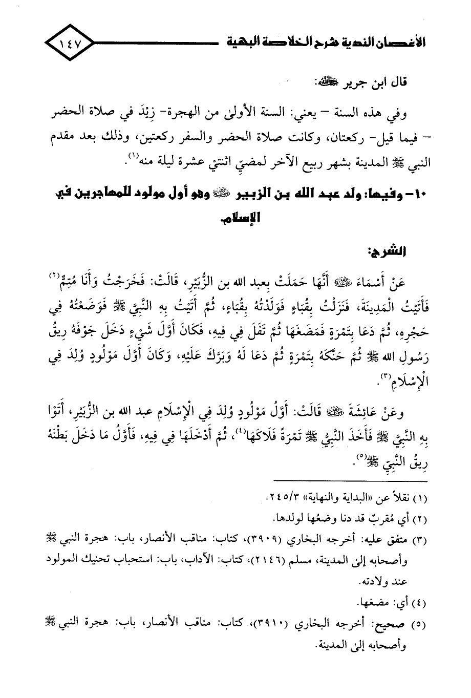 (¬3) متفق عليه: أخرجه البخاري (3909)، كتاب: مناقب الأنصار، باب: هجرة النبي - صلى الله عليه وسلم - وأصحابه إلى المدينة, مسلم (2146)، كتاب: الآداب، باب: استحباب تحنيك المولود عند ولادته.
