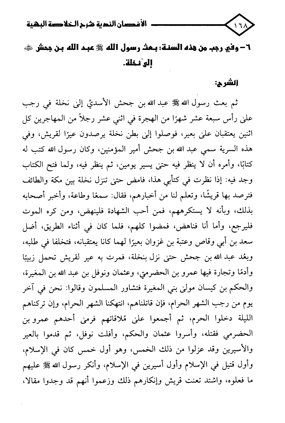 6 - وفي رجب في هذه السنة: بعث رسول الله - صلى الله عليه وسلم - عبد الله بن جحش - رضي الله عنه - إلى نخلة.