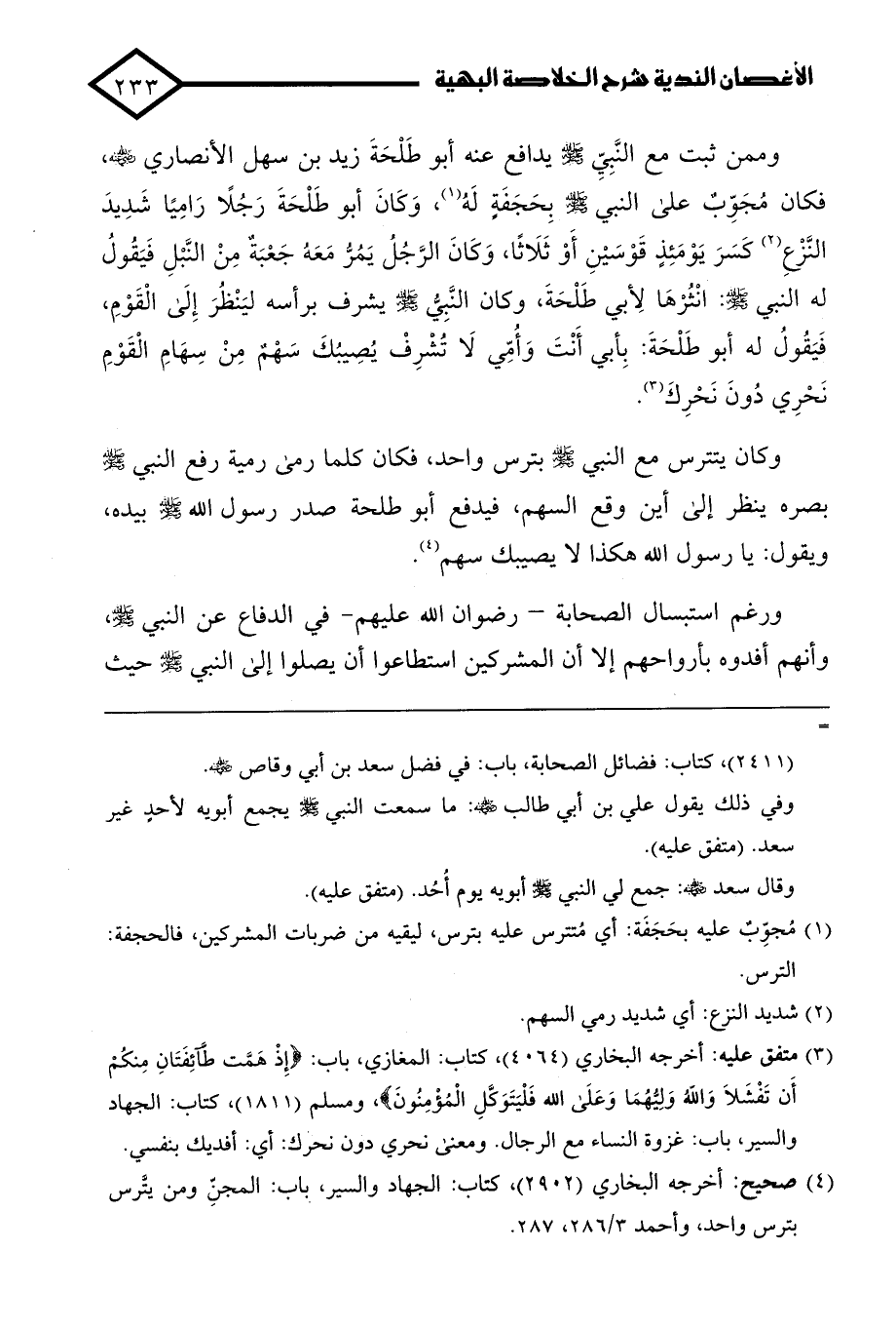 (¬3) متفق عليه: أخرجه البخاري (4064)، كتاب: المغازي، باب: {إِذْ هَمَّتْ طَائِفَتَانِ مِنْكُمْ أَنْ تَفْشَلَا وَاللَّهُ وَلِيُّهُمَا وَعَلَى اللَّهِ فَلْيَتَوَكَّلِ الْمُؤْمِنُونَ}، ومسلم (1811)، كتاب: الجهاد والسير، باب: غزوة النساء مع الرجال. ومعنى نحري دون نحرك: أي: أفديك بنفسي.