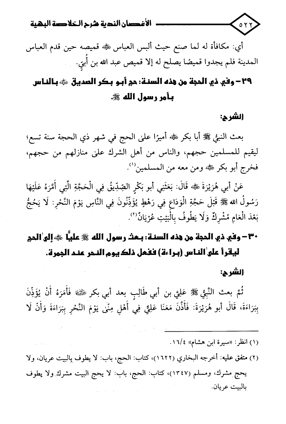 30 - وفي ذي الحجه من هذه السنة: بعث رسول الله -صلى الله عليه وسلم - عليًّا - رضي الله عنه - إلى الحج ليقرأ على الناس (براءة) ففعل ذلك يوم النحر عند الجمرة.