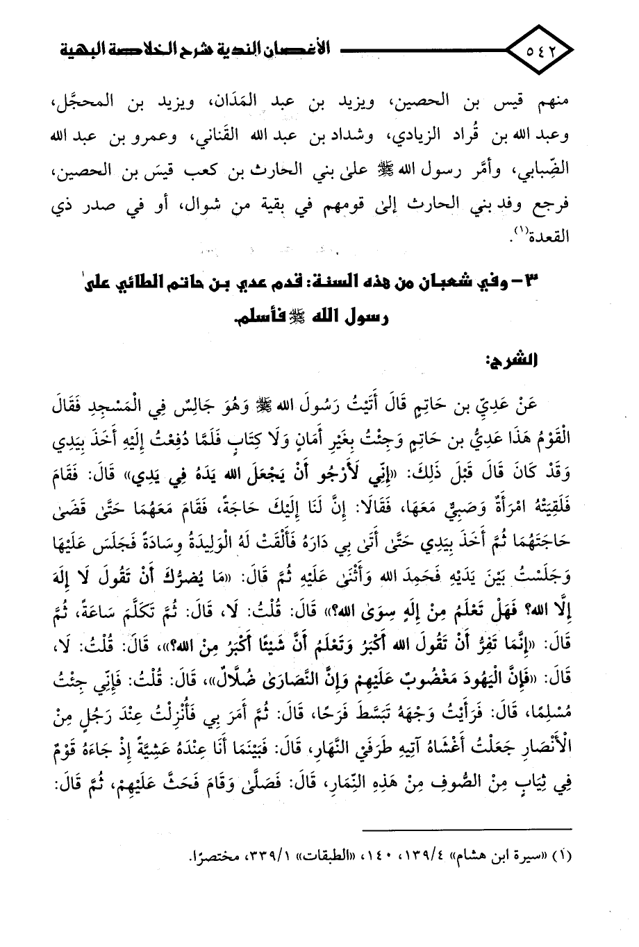 عَنْ عَدِيِّ بن حَاتِمٍ قَالَ أَتَيْتُ رَسُولَ الله - صلى الله عليه وسلم - وَهُوَ جَالِسٌ فِي الْمَسْجِدِ فَقَالَ الْقَوْمُ هَذَا عَدِيُّ بن حَاتِمٍ وَجِئْتُ بِغَيْرِ أَمَانٍ وَلا كِتَابٍ فَلَمَّا دُفِعْتُ إِلَيْهِ أَخَذَ بِيَدِي وَقَدْ كَانَ قَالَ قَبْلَ ذَلِكَ: "إِنِّي لَأَرْجُو أَنْ يَجْعَلَ الله يَدَهُ فِي يَدِي" قَالَ: فَقَامَ فَلَقِيَتْهُ امْرَأَةٌ وَصَبِيٌّ مَعَهَا، فَقَالَا: إِنَّ لَنَا إِلَيْكَ حَاجَةً، فَقَامَ مَعَهُمَا حَتَّى قَضَى حَاجَتَهُمَا ثُمَّ أَخَذَ بِيَدِي حَتَّى أَتَى بِي دَارَهُ فَأَلْقَتْ لَهُ الْوَلِيدَةُ وِسَادَةً فَجَلَسَ عَلَيْهَا وَجَلَسْتُ بَيْنَ يَدَيْهِ فَحَمِدَ الله وَأَثْنَى عَلَيْهِ ثُمَّ قَالَ: "مَا يُضرُّكَ أَنْ تَقُولَ لَا إِلَهَ إِلَّا الله؟ فَهَلْ تَعْلَمُ مِنْ إِلَهٍ سِوَى الله؟ " قَالَ: قُلْتُ: لَا، قَالَ: ثُمَّ تَكَلَّمَ سَاعَةً، ثُمَّ قَالَ: "إِنَّمَا تَفِرُّ أَنْ تَقُولَ الله أَكْبَرُ وَتَعْلَمُ أَنَّ شَيْئًا أَكبَرُ مِنْ الله؟ "، قَال: قُلْتُ: لَا، قَالَ: "فَإنَّ الْيَهُودَ مَغْضُوبٌ عَلَيهِمْ وَإِنَّ النَّصَارَى ضُلَّالٌ"، قَالَ: قُلْتُ: فَإِنِّي جِئْتُ مُسْلِمًا، قَالَ: فَرَأَيْتُ وَجْهَهُ تَبَسَّطَ فَرَحًا، قَالَ: ثُمَّ أَمَرَ بِي فَأُنْزِلْتُ عِنْدَ رَجُلٍ مِنْ الْأَنْصَارِ جَعَلْتُ أَغْشَاهُ آتِيهِ طَرَفَيْ النَّهَارِ، قَالَ: فَبَيْنَمَا أَنَا عِنْدَهُ عَشِيَّةً إِذْ جَاءَهُ قَوْمٌ في ثِيَابٍ مِنْ الصُّوفِ مِنْ هَذِهِ النِّمَارِ، قَالَ: فَصَلَّى وَقَامَ فَحَثَّ عَلَيْهِمْ، ثُم قَالَ: