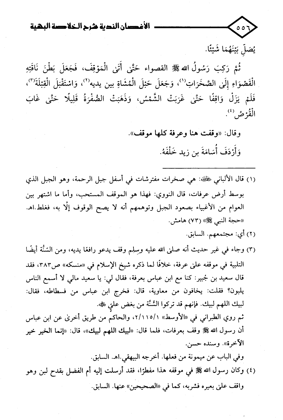 (¬3) وجاء في غير حديث أنه صلى الله عليه وسلم وقف يدعو رافعًا يديه ومن السنُّة أيضًا التلبية في موقفه على عرفة، خلافًا لما ذكره شيخ الإِسلام في "منسكه" ص 383، فقد قال سعيد بن جُبير: كنا مع ابن عباس بعرفة، فقال لي: يا سعيد مالي لا أسمع الناس يلبون؟ فقلت: يخافون من معاوية، قال: فخرج ابن عباس من فسطاطه، فقال: لبيك اللهم لبيك. فإنهم قد تركوا السُّنَّة من بغض عليٍّ- رضي الله عنه -.